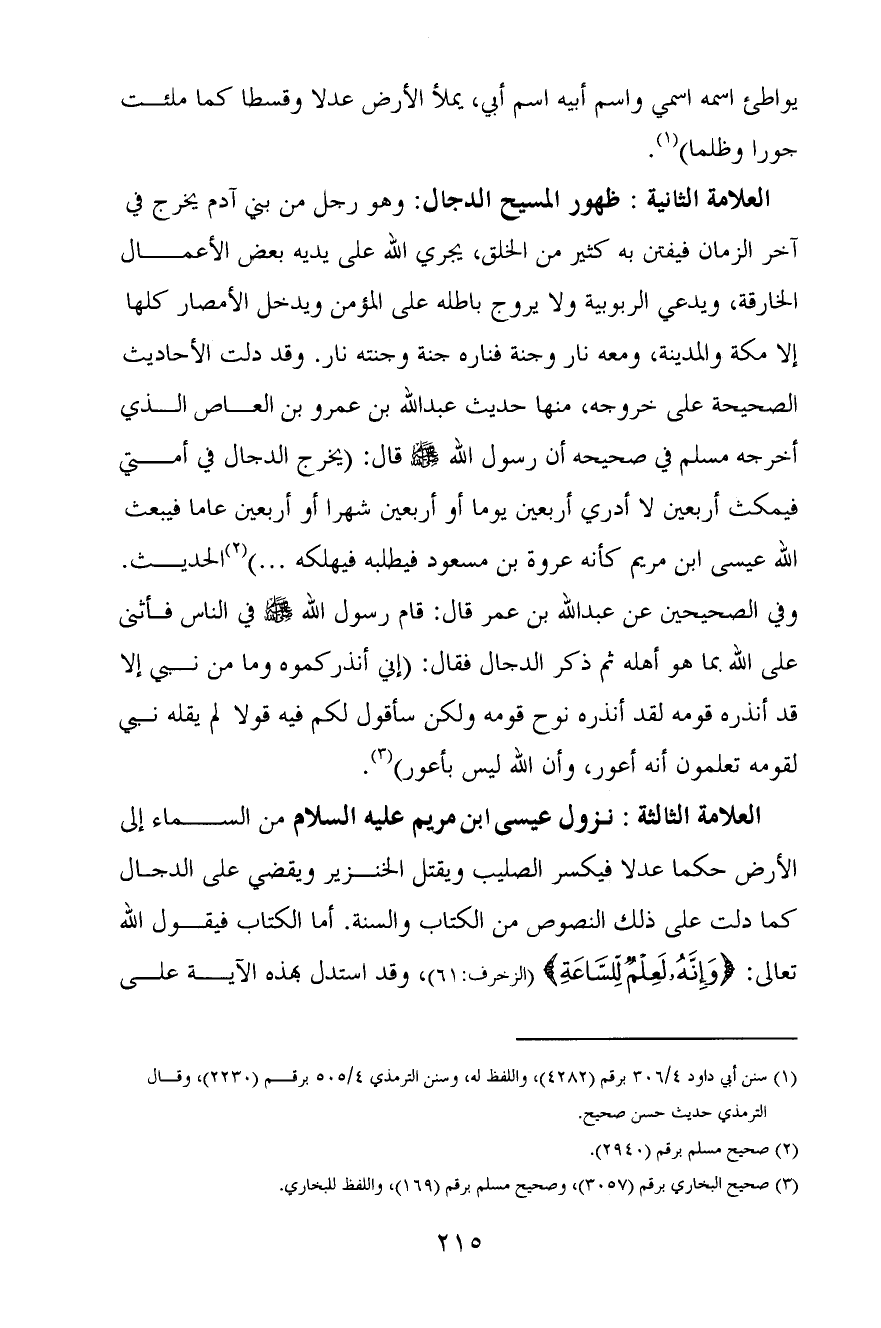 العلامة الثانية: ظهور المسيح الدجال: وهو رجل من بني آدم يخرج في آخر الزمان فيفتن به كثير من الخلق، يجري الله على يديه بعض الأعمال الخارقة، ويدعي الربوبية ولا يروج باطله على المؤمن ويدخل الأمصار كلها إلا مكة والمدينة، ومعه نار وجنة فناره جنة وجنته نار. وقد دلت الأحاديث الصحيحة على خروجه، منها حديث عبد الله بن عمرو بن العاص الذي أخرجه مسلم في صحيحه أن رسول الله صَلَّى اللَّهُ عَلَيْهِ وَسَلِّم قال: «يخرج الدجال في أمتي فيمكث أربعين لا أدري أربعين يوما أو أربعين شهرا أو أربعين عاما فيبعث الله عيسى ابن مريم كأنه عروة بن مسعود فيطلبه فيهلكه» . . .) (¬2) الحديث. وفي الصحيحين عن عبد الله بن عمر قال: قام رسول الله صَلَّى اللَّهُ عَلَيْهِ وَسَلِّم في الناس فأثنى على الله بما هو أهله ثم ذكر الدجال فقال: «إني أنذركموه وما من نبي إلا قد أنذره قومه لقد أنذره نوح قومه ولكن سأقول لكم فيه قولا لم يقله نبي لقومه تعلمون أنه أعور، وأن الله ليس بأعور» (¬3) .