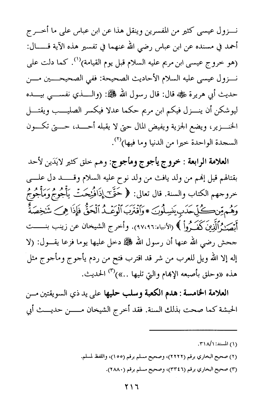 نزول عيسى كثير من المفسرين وينقل هذا عن ابن عباس على ما أخرج أحمد في مسنده عن ابن عباس رضي الله عنهما في تفسير هذه الآية قال: «هو خروج عيسى ابن مريم عليه السلام قبل يوم القيامة» (¬1) . كما دلت على نزول عيسى عليه السلام الأحاديث الصحيحة: ففيِ الصحيحين من حديث أبي هريرة رضي الله عنه قال: قال رسول الله صَلَّى اللَّهُ عَلَيْهِ وَسَلِّم: «والذي نفسي بيده ليوشكن أن ينزل فيكم ابن مريم حكما عدلا فيكسر الصليب ويقتل الخنزير، ويضع الجزية ويفيض المال حتى لا يقبله أحد، حتى تكون السجدة الواحدة خيرا من الدنيا وما فيها» (¬2) .