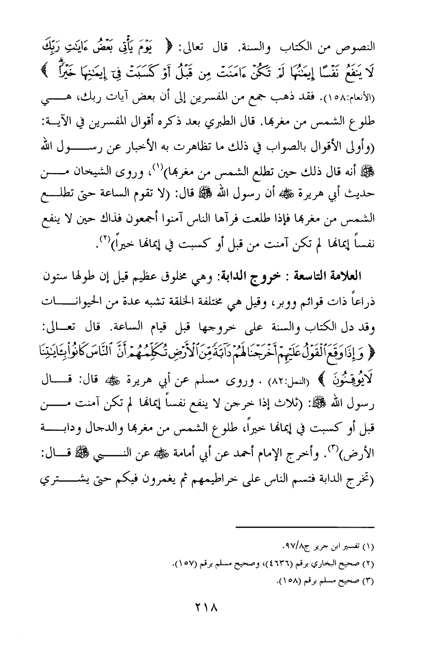 النصوص من الكتاب والسنة. قال تعالى: {يَوْمَ يَأْتِي بَعْضُ آيَاتِ رَبِّكَ لَا يَنْفَعُ نَفْسًا إِيمَانُهَا لَمْ تَكُنْ آمَنَتْ مِنْ قَبْلُ أَوْ كَسَبَتْ فِي إِيمَانِهَا خَيْرًا} [الأنعام: 158] (الأنعام: 158) . فقد ذهب جمع من المفسرين إلى أن بعض آيات ربك، هي طلوع الشمس من مغربها. قال الطبري بعد ذكره أقوال المفسرين في الآية: (وأولى الأقوال بالصواب في ذلك ما تظاهرت به الأخبار عن رسول الله صَلَّى اللَّهُ عَلَيْهِ وَسَلِّم أنه قال ذلك حين تطلع الشمس من مغربها) (¬1) وروى الشيخان من حديث أبي هريرة رضي الله عنه أن رسول الله صَلَّى اللَّهُ عَلَيْهِ وَسَلِّم قال: «لا تقوم الساعة حتى تطلع الشمس من مغربها فإذا طلعت فرآها الناس آمنوا أجمعون فذاك حين لا ينفع نفسًا إيمانها لم تكن آمنت من قبل أو كسبت في إيمانها خيرًا» (¬2) .