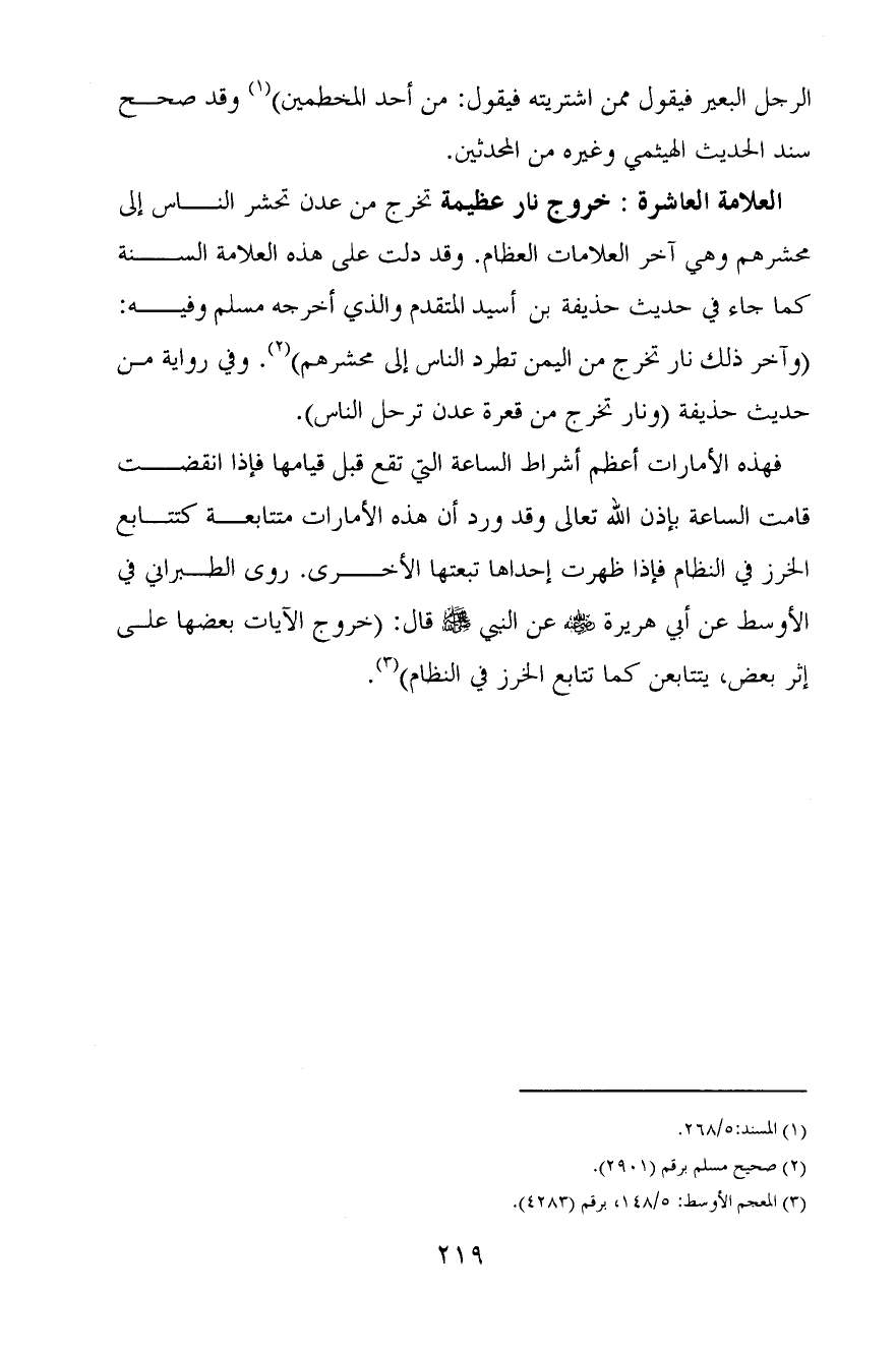 العلامة العاشرة: خروج نار عظيمة تخرج من عدن تحشر الناس إلى محشرهم وهي آخر العلامات العظام. وقد دلت على هذه العلامة السنة كما جاء في حديث حذيفة بن أسيد المتقدم والذي أخرجه مسلم وفيه: «وآخر ذلك نار تخرج من اليمن تطرد الناس إلى محشرهم» (¬2) . وفي رواية من حديث حذيفة «ونار تخرج من قعرة عدن ترحل الناس» .