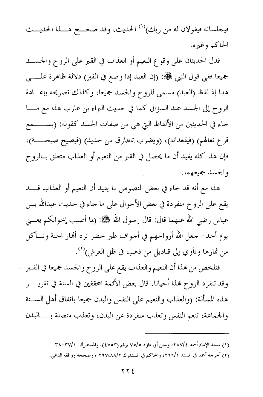 فدل الحديثان على وقوع النعيم أو العذاب في القبر على الروح والجسد جميعا ففي قول النبي صَلَّى اللَّهُ عَلَيْهِ وَسَلِّم: «إن العبد إذا وضع في القبر» دلالة ظاهرة على هذا إذ لفظ (العبد) مسمى للروح والجسد جميعا، وكذلك تصريحه بإعادة الروح إلى الجسد عند السؤال كما في حديث البراء بن عازب هذا مع ما جاء في الحديثين من الألفاظ التي هي من صفات الجسد كقوله: «يسمع قرع نعالهم» (فيقعدانه) ، «ويضرب بمطارق من حديد» «فيصيح صيحة» ، فإن هذا كله يفيد أن ما يحصل في القبر من النعيم أو العذاب متعلق بالروح والجسد جميعهما.