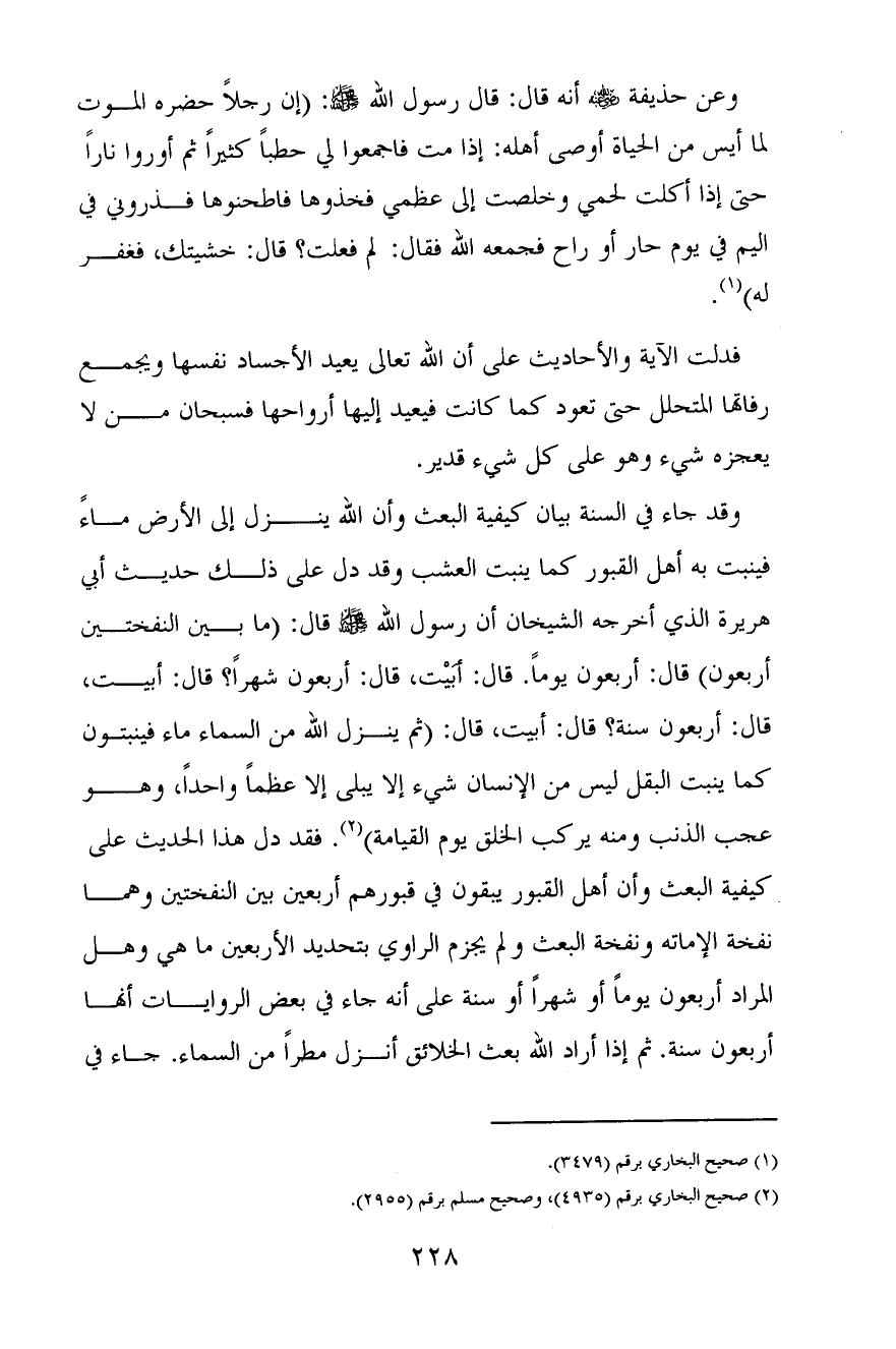 وقد جاء في السنة بيان كيفية البعث وأن الله ينزل إلى الأرض ماءً فينبت به أهل القبور كما ينبت العشب وقد دل على ذلك حديث أبي هريرة الذي أخرجه الشيخان «أن رسول الله صَلَّى اللَّهُ عَلَيْهِ وَسَلِّم قال: (ما بين النفختين أربعون) قال: أربعون يومًا. قال: أبَيْت، قال: أربعون شهرًا؟ قال: أبيت، قال: أربعون سنة؟ قال: أبيت، قال: (ثم ينزل الله من السماء ماء فينبتون كما ينبت البقل ليس من الإنسان شيء إلا يبلى إلا عظمًا واحدًا، وهو عجب الذنب ومنه يركب الخلق يوم القيامة» (¬2) . فقد دل هذا الحديث على كيفية البعث وأن أهل القبور يبقون في قبورهم أربعين بين النفختين وهما نفخة الإماتة ونفخة البعث ولم يجزم الراوي بتحديد الأربعين ما هي وهل المراد أربعون يومًا أو شهرًا أو سنة على أنه جاء في بعض الروايات أنها أربعون سنة. ثم إذا أراد الله بعث الخلائق أنزل مطرًا من السماء. جاء في