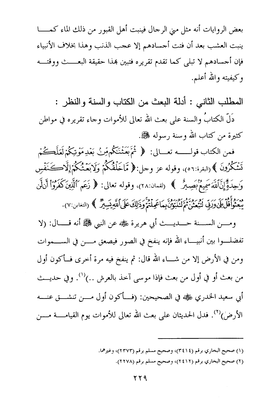 المطلب الثاني: أدلة البعث من الكتاب والسنة والنظر: دَلّ الكتابُ والسنة على بعث الله تعالى للأموات وجاء تقريره في مواطن كثيرة من كتاب الله وسنة رسوله صَلَّى اللَّهُ عَلَيْهِ وَسَلِّم.