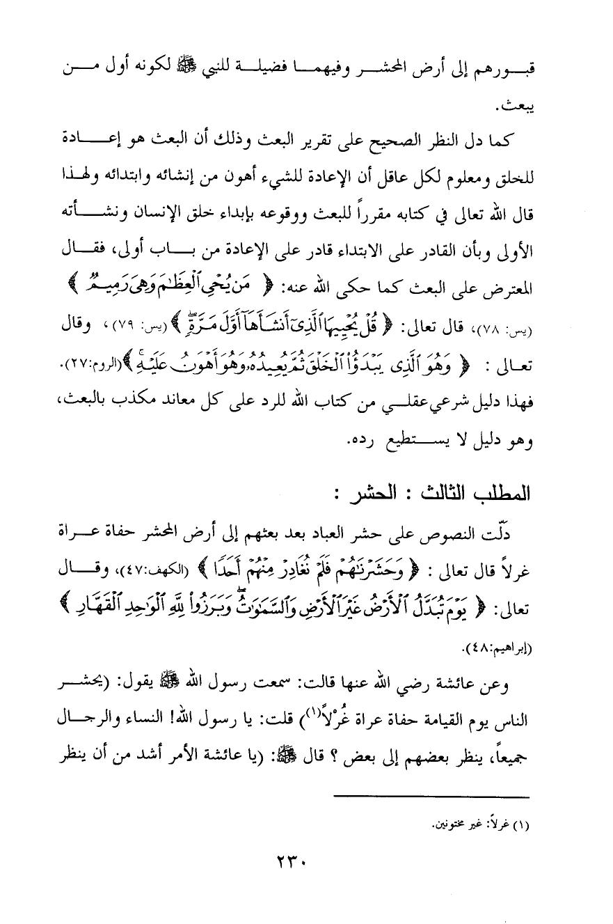 المطلب الثالث: الحشر: دلت النصوص على حشر العباد بعد بعثهم إلى أرض المحشر حفاة عراة غرلا قال تعالى: {وَحَشَرْنَاهُمْ فَلَمْ نُغَادِرْ مِنْهُمْ أَحَدًا} [الكهف: 47] (الكهف: 47) ، وقال تعالى: {يَوْمَ تُبَدَّلُ الْأَرْضُ غَيْرَ الْأَرْضِ وَالسَّمَاوَاتُ وَبَرَزُوا لِلَّهِ الْوَاحِدِ الْقَهَّارِ} [إبراهيم: 48] (إبراهيم: 48) .