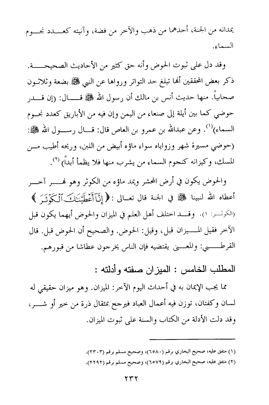 وقد دل على ثبوت الحوض وأنه حق كثير من الأحاديث الصحيحة ذكر بعض المحققين أنها تبلغ حد التواتر ورواها عن النبي صَلَّى اللَّهُ عَلَيْهِ وَسَلِّم بضعة وثلاثون صحابيًّا. منها حديث أنس بن مالك أن رسول الله صَلَّى اللَّهُ عَلَيْهِ وَسَلِّم قال: «إن قدر حوضي كما بين أيلة إلى صنعاء من اليمن وإن فيه من الأباريق كعدد نجوم السماء» (¬1) . وعن عبد الله بن عمرو بن العاص قال: قال رسول الله صَلَّى اللَّهُ عَلَيْهِ وَسَلِّم: «حوضي مسيرة شهر وزواياه سواء ماؤه أبيض من اللبن، وريحه أطيب من المسك، وكيزانه كنجوم السماء من يشرب منها فلا يظمأ أبدًا» (¬2) .