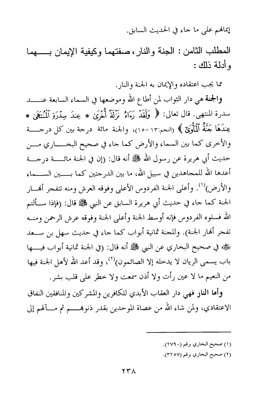 المطلب الثامن: الجنة والنار، صفتهما وكيفية الإيمان بهما وأدلة ذلك: مما يجب اعتقاده والإيمان به الجنة والنار.