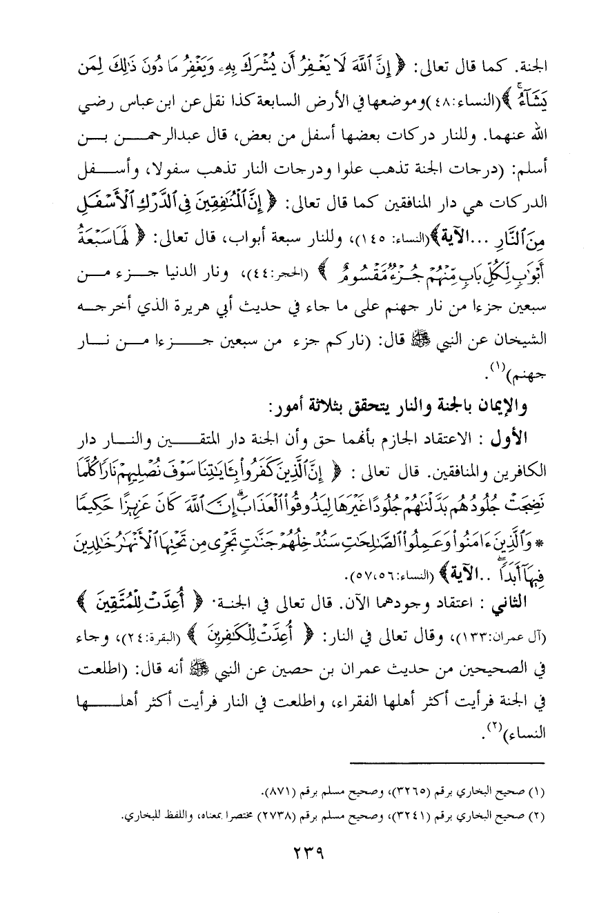 الثاني: اعتقاد وجودهما الآن. قال تعالى في الجنة. {أُعِدَّتْ لِلْمُتَّقِينَ} [آل عمران: 133] (آل عمران: 133) ، وقال تعالى في النار: {أُعِدَّتْ لِلْكَافِرِينَ} [البقرة: 24] (البقرة: 24) ، وجاء في الصحيحين من حديث عمران بن حصين عن النبي صَلَّى اللَّهُ عَلَيْهِ وَسَلِّم أنه قال: «اطلعت في الجنة فرأيت أكثر أهلها الفقراء، واطلعت في النار فرأيت أكثر أهلها النساء» (¬2) .