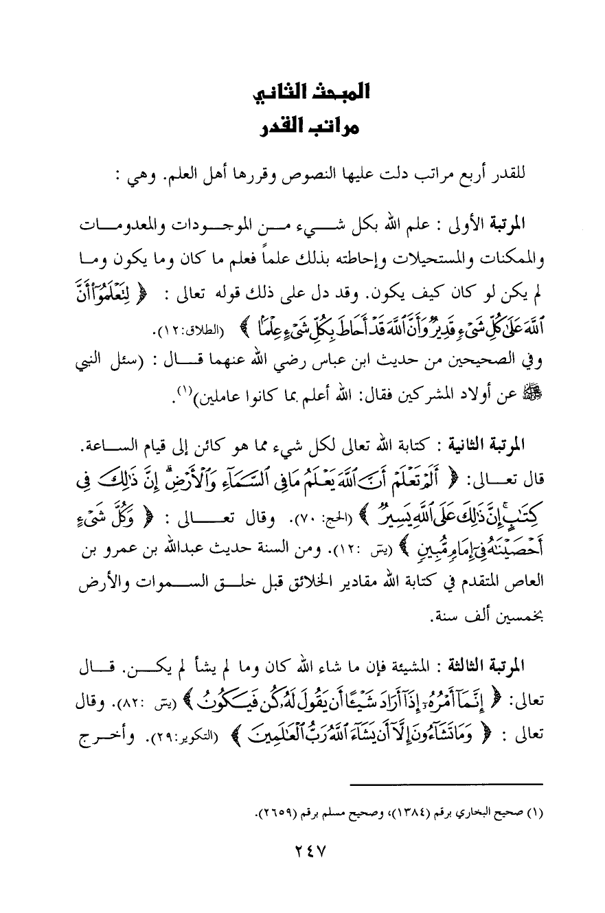 المبحث الثاني: مراتب القدر للقدر أربع مراتب دلت عليها النصوص وقررها أهل العلم. وهي: