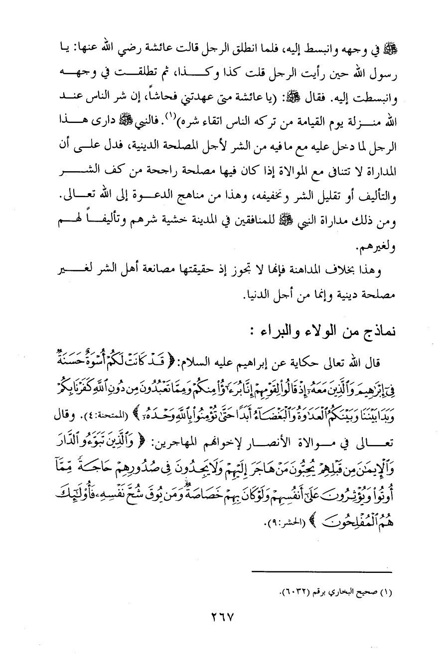 صَلَّى اللَّهُ عَلَيْهِ وَسَلِّم في وجهه وانبسط إليه، فلما انطلق الرجل قالت عائشة رضي الله عنها: يا رسول الله حين رأيت الرجل قلت كذا وكذا، ثم تطلقت في وجهه وانبسطت إليه. فقال صَلَّى اللَّهُ عَلَيْهِ وَسَلِّم: (يا عائشة متى عهدتني فحاشًا، إن شر الناس عند الله منزلة يوم القيامة من تركه الناس اتقاء شره) » (¬1) . فالنبي صَلَّى اللَّهُ عَلَيْهِ وَسَلِّم دارى هذا الرجل لما دخل عليه مع ما فيه من الشر لأجل المصلحة الدينية، فدل على أن المداراة لا تتنافى مع الموالاة إذا كان فيها مصلحة راجحة من كف الشر والتأليف أو تقليل الشر وتخفيفه، وهذا من مناهج الدعوة إلى الله تعالى. ومن ذلك مداراة النبي صَلَّى اللَّهُ عَلَيْهِ وَسَلِّم للمنافقين في المدينة خشية شرهم وتأليفًا لهم ولغيرهم.