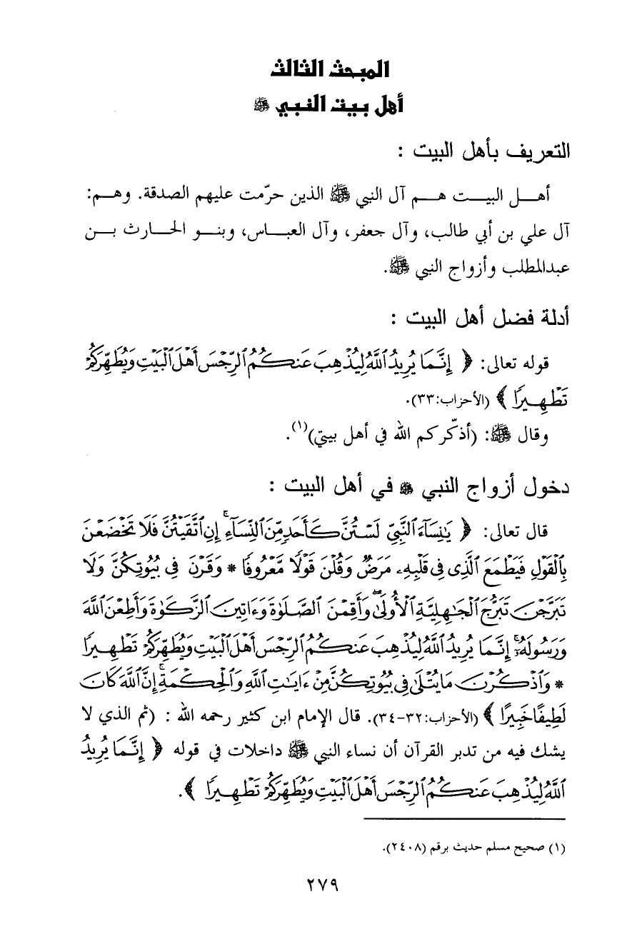 دخول أزواج النبي صَلَّى اللَّهُ عَلَيْهِ وَسَلِّم في أهل البيت: قال تعالى: {يَا نِسَاءَ النَّبِيِّ لَسْتُنَّ كَأَحَدٍ مِنَ النِّسَاءِ إِنِ اتَّقَيْتُنَّ فَلَا تَخْضَعْنَ بِالْقَوْلِ فَيَطْمَعَ الَّذِي فِي قَلْبِهِ مَرَضٌ وَقُلْنَ قَوْلًا مَعْرُوفًا - وَقَرْنَ فِي بُيُوتِكُنَّ وَلَا تَبَرَّجْنَ تَبَرُّجَ الْجَاهِلِيَّةِ الْأُولَى وَأَقِمْنَ الصَّلَاةَ وآتِينَ الزَّكَاةَ وَأَطِعْنَ اللَّهَ وَرَسُولَهُ إِنَّمَا يُرِيدُ اللَّهُ لِيُذْهِبَ عَنْكُمُ الرِّجْسَ أَهْلَ الْبَيْتِ وَيُطَهِّرَكُمْ تَطْهِيرًا - وَاذْكُرْنَ مَا يُتْلَى فِي بُيُوتِكُنَّ مِنْ آيَاتِ اللَّهِ وَالْحِكْمَةِ إِنَّ اللَّهَ كَانَ لَطِيفًا خَبِيرًا} [الأحزاب: 32 - 34] (الأحزاب: 32-34) . قال الإمام ابن كثير رحمه الله: (ثم الذي لا يشك فيه من تدبر القرآن أن نساء النبي صَلَّى اللَّهُ عَلَيْهِ وَسَلِّم داخلات في قوله {إِنَّمَا يُرِيدُ اللَّهُ لِيُذْهِبَ عَنْكُمُ الرِّجْسَ أَهْلَ الْبَيْتِ وَيُطَهِّرَكُمْ تَطْهِيرًا} [الأحزاب: 33]