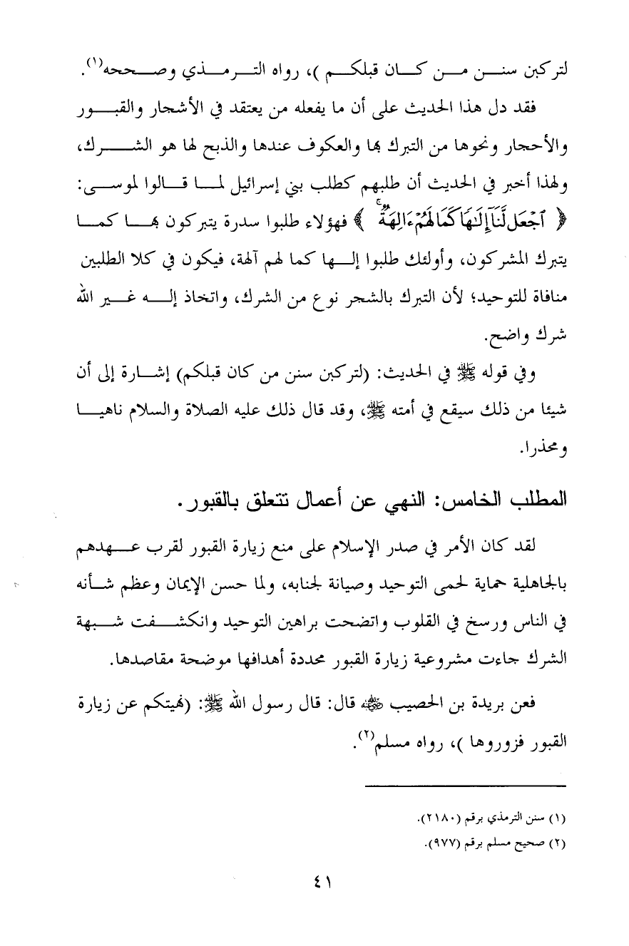 المطلب الخامس: النهي عن أعمال تتعلق بالقبور. لقد كان الأمر في صدر الإسلام على منع زيارة القبور لقرب عهدهم بالجاهلية حماية لحمى التوحيد وصيانة لجنابه، ولما حسن الإيمان وعظم شأنه في الناس ورسخ في القلوب واتضحت براهين التوحيد وانكشفت شبهة الشرك جاءت مشروعية زيارة القبور محددة أهدافها موضحة مقاصدها.
