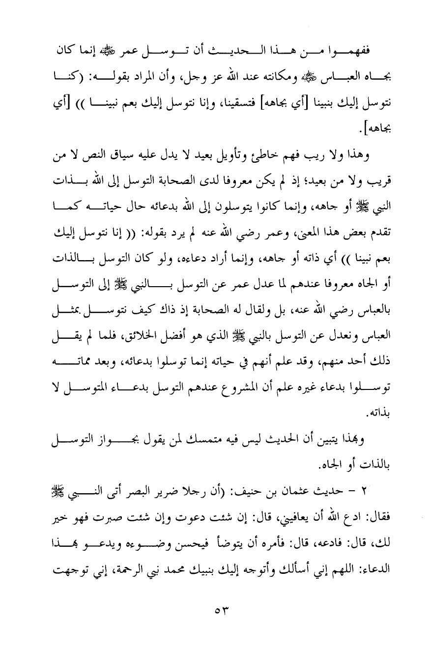 ففهموا من هذا الحديث أن توسل عمر رضي الله عنه إنما كان بجاه العباس رضي الله عنه ومكانته عند الله عز وجل، وأن المراد بقوله: «كنا نتوسل إليك بنبينا [أي بجاهه] فتسقينا، وإنا نتوسل إليك بعم نبينا» [أي بجاهه] .