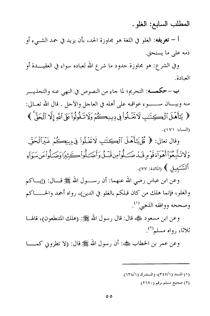 المطلب السابع: الغلو. أ- تعريفه: الغلو في اللغة هو مجاوزة الحد، بأن يزيد في حمد الشيء أو ذمه على ما يستحق.