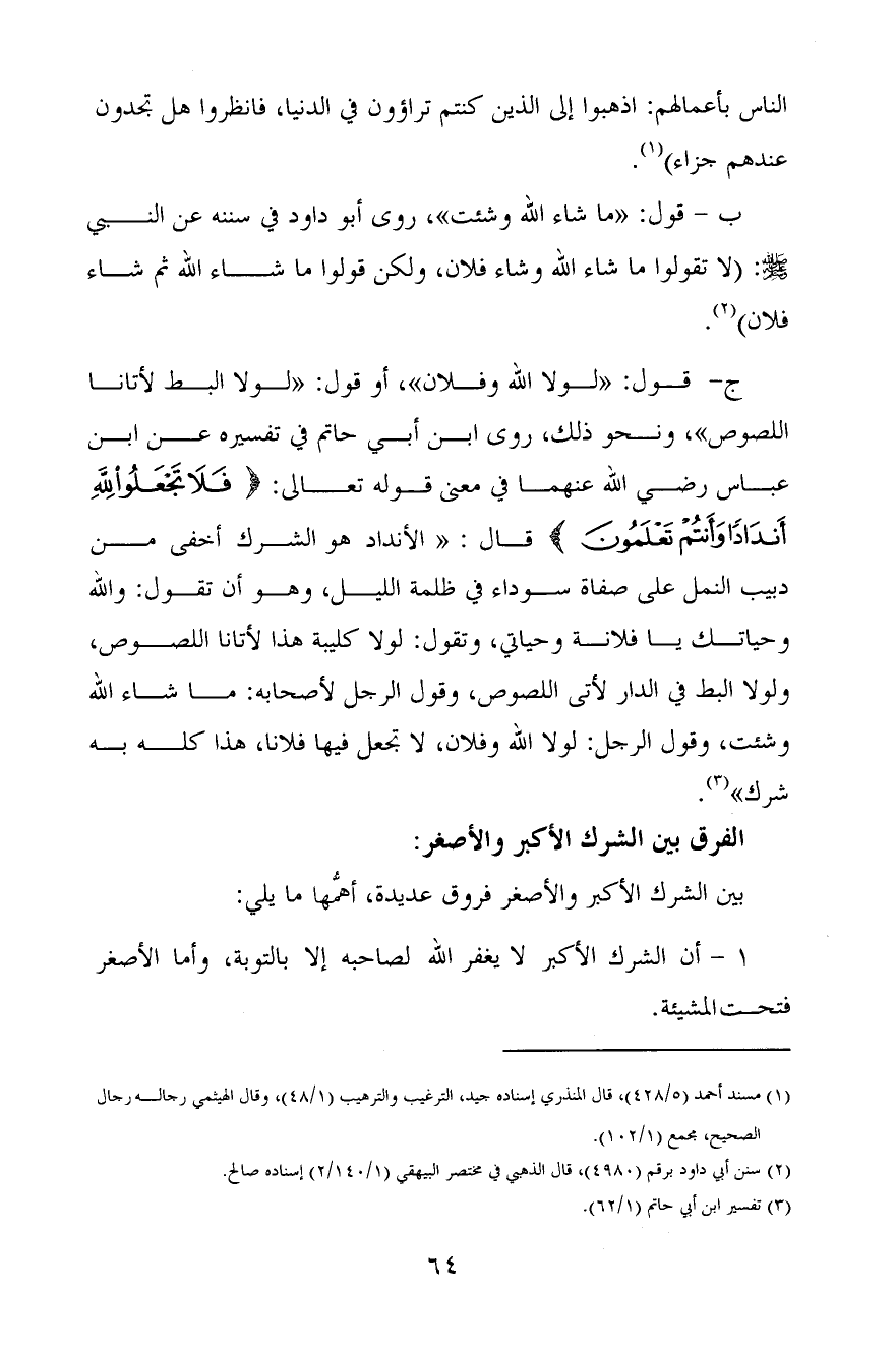 الفرق بين الشرك الأكبر والأصغر: بين الشرك الأكبر والأصغر فروق عديدة، أهمها ما يلي:
