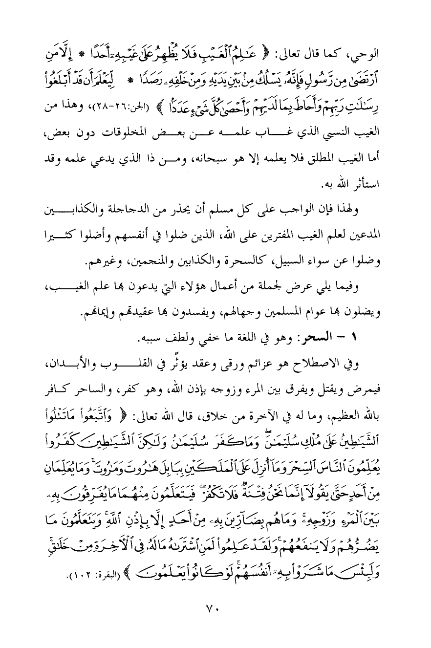 وفي الاصطلاح هو عزائم ورقى وعقد يؤثِّر في القلوب والأبدان، فيمرض ويقتل ويفرق بين المرء وزوجه بإذن الله، وهو كفر، والساحر كافر بالله العظيم، وما له في الآخرة من خلاق، قال الله تعالى: {وَاتَّبَعُوا مَا تَتْلُو الشَّيَاطِينُ عَلَى مُلْكِ سُلَيْمَانَ وَمَا كَفَرَ سُلَيْمَانُ وَلَكِنَّ الشَّيَاطِينَ كَفَرُوا يُعَلِّمُونَ النَّاسَ السِّحْرَ وَمَا أُنْزِلَ عَلَى الْمَلَكَيْنِ بِبَابِلَ هَارُوتَ وَمَارُوتَ وَمَا يُعَلِّمَانِ مِنْ أَحَدٍ حَتَّى يَقُولَا إِنَّمَا نَحْنُ فِتْنَةٌ فَلَا تَكْفُرْ فَيَتَعَلَّمُونَ مِنْهُمَا مَا يُفَرِّقُونَ بِهِ بَيْنَ الْمَرْءِ وَزَوْجِهِ وَمَا هُمْ بِضَارِّينَ بِهِ مِنْ أَحَدٍ إِلَّا بِإِذْنِ اللَّهِ وَيَتَعَلَّمُونَ مَا يَضُرُّهُمْ وَلَا يَنْفَعُهُمْ وَلَقَدْ عَلِمُوا لَمَنِ اشْتَرَاهُ مَا لَهُ فِي الْآخِرَةِ مِنْ خَلَاقٍ وَلَبِئْسَ مَا شَرَوْا بِهِ أَنْفُسَهُمْ لَوْ كَانُوا يَعْلَمُونَ} [البقرة: 102] (البقرة: 102) .