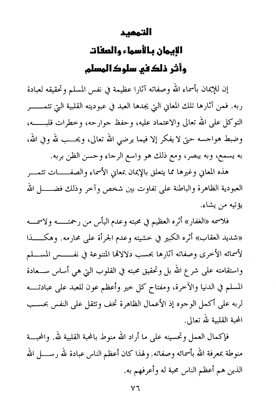التمهيد: الإيمان بالأسماء والصفات وأثر ذلك في سلوك المسلم إن للإيمان بأسماء الله وصفاته آثارا عظيمة في نفس المسلم وتحقيقه لعبادة ربه. فمن آثارها تلك المعاني التي يجدها العبد في عبوديته القلبية التي تثمر التوكل على الله تعالى والاعتماد عليه، وحفظ جوارحه، وخطرات قلبه، وضبط هواجسه حتى لا يفكر إلا فيما يرضي الله تعالى، ويحب لله وفي الله، به يسمع، وبه يبصر، ومع ذلك هو واسع الرجاء وحسن الظن بربه.