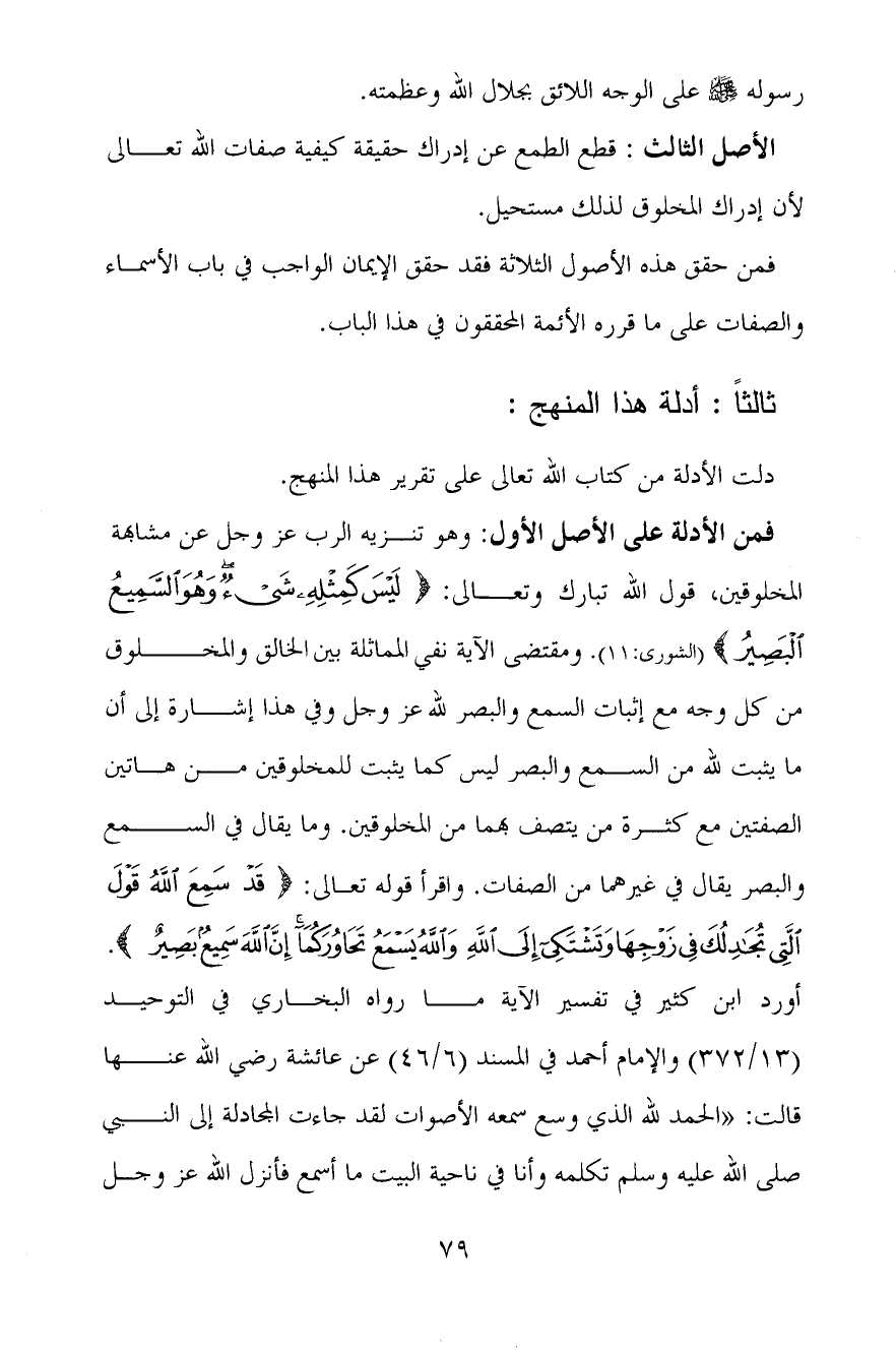 فمن الأدلة على الأصل الأول: وهو تنزيه الرب عز وجل عن مشابهة المخلوقين، قول الله تبارك وتعالى: {لَيْسَ كَمِثْلِهِ شَيْءٌ وَهُوَ السَّمِيعُ الْبَصِيرُ} [الشورى: 11] (الشورى: 11) . ومقتضى الآية نفي المماثلة بين الخالق والمخلوق من كل وجه مع إثبات السمع والبصر لله عز وجل وفي هذا إشارة إلى أن ما يثبت لله من السمع والبصر ليس كما يثبت للمخلوقين من هاتين الصفتين مع كثرة من يتصف بهما من المخلوقين. وما يقال في السمع والبصر يقال في غيرهما من الصفات. واقرأ قوله تعالى: {قَدْ سَمِعَ اللَّهُ قَوْلَ الَّتِي تُجَادِلُكَ فِي زَوْجِهَا وَتَشْتَكِي إِلَى اللَّهِ وَاللَّهُ يَسْمَعُ تَحَاوُرَكُمَا إِنَّ اللَّهَ سَمِيعٌ بَصِيرٌ} [المجادلة: 1] أورد ابن كثير في تفسير الآية ما رواه البخاري في التوحيد (13 / 372) والإمام أحمد في المسند (6 / 46) عن عائشة رضي الله عنها قالت: " الحمد لله الذي وسع سمعه الأصوات لقد جاءت المجادلة إلى النبي صلى الله عليه وسلم تكلمه وأنا في ناحية البيت ما أسمع فأنزل الله عز وجل