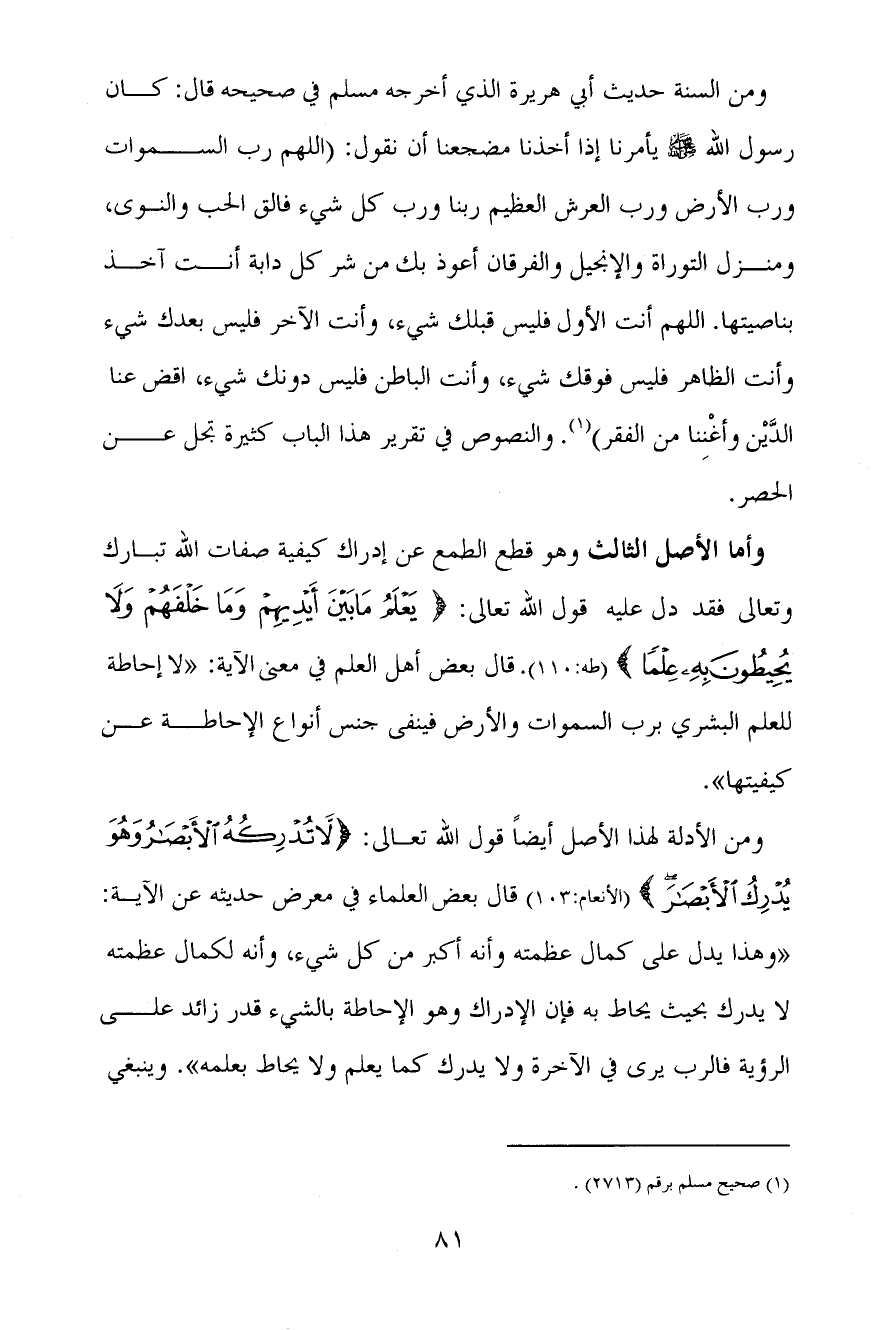 وأما الأصل الثالث وهو قطع الطمع عن إدراك كيفية صفات الله تبارك وتعالى فقد دل عليه قول الله تعالى: {يَعْلَمُ مَا بَيْنَ أَيْدِيهِمْ وَمَا خَلْفَهُمْ وَلَا يُحِيطُونَ بِهِ عِلْمًا} [طه: 110] (طه: 110) . قال بعض أهل العلم في معنى الآية: " لا إحاطة للعلم البشري برب السماوات والأرض فينفي جنس أنواع الإحاطة عن كيفيتها ".