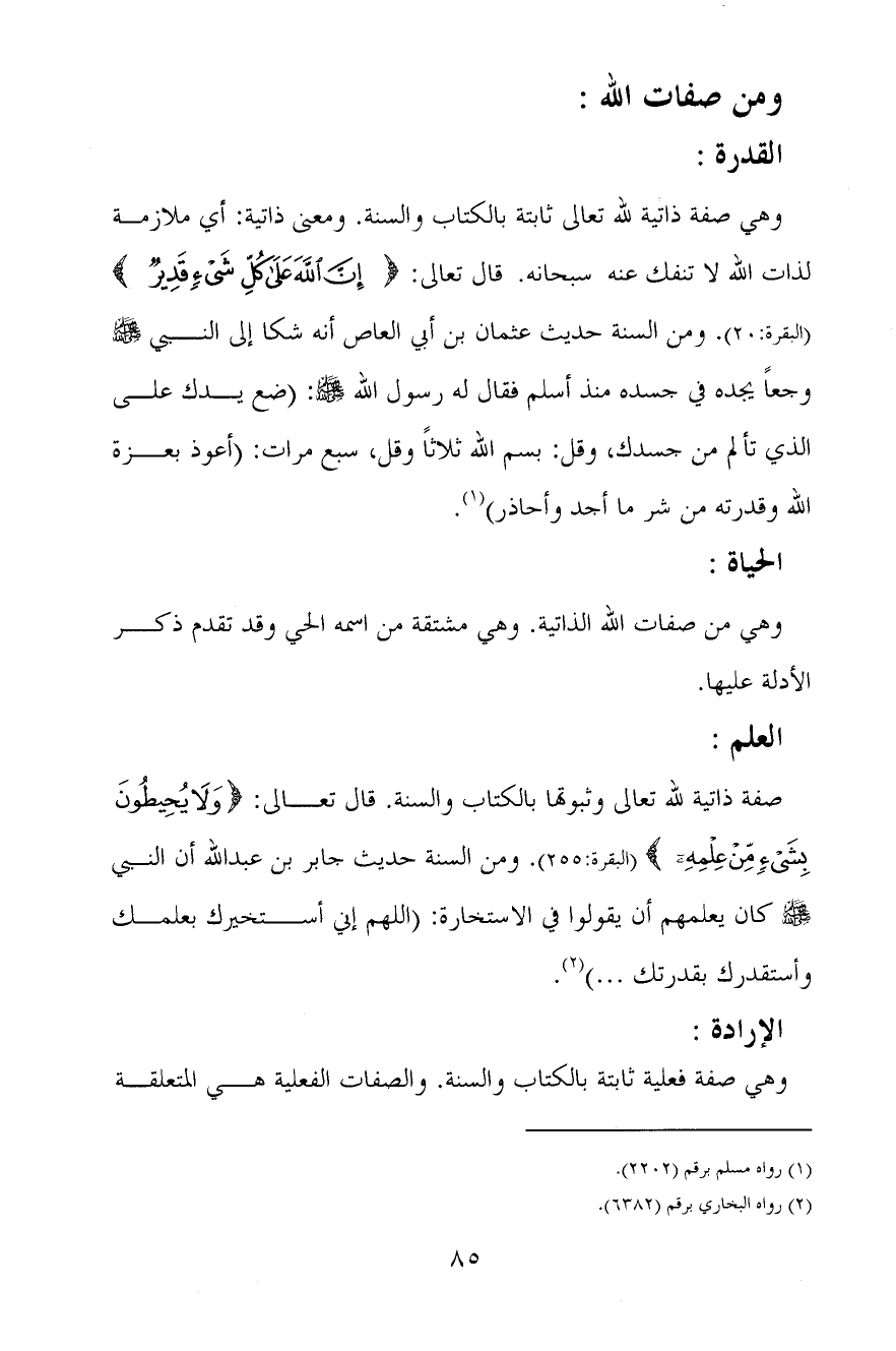 القدرة: وهي صفة ذاتية لله تعالى ثابتة بالكتاب والسنة. ومعنى ذاتية: أي ملازمة لذات الله لا تنفك عنه سبحانه. قال تعالى: {إِنَّ اللَّهَ عَلَى كُلِّ شَيْءٍ قَدِيرٌ} [البقرة: 20] (البقرة: 20) . ومن السنة حديث عثمان بن أبي العاص أنه شكا إلى النبي صلى الله عليه وسلم وجعًا يجده في جسده منذ أسلم فقال له رسول الله صلى الله عليه وسلم: «ضع يدك على الذي تألم من جسدك، وقل: بسم الله ثلاثًا وقل، سبع مرات: (أعوذ بعزة الله وقدرته من شر ما أجد وأحاذر» (¬1) .