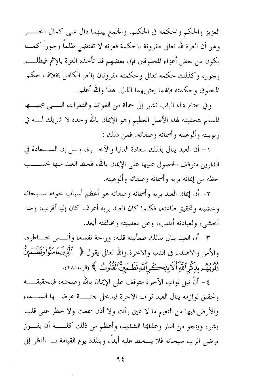 1 - أن العبد ينال بذلك سعادة الدنيا والآخرة، بل إن السعادة في الدارين متوقف الحصول عليها على الإيمان بالله، فحظ العبد منها بحسب حظه من إيمانه بربه وأسمائه وصفاته وألوهيته.