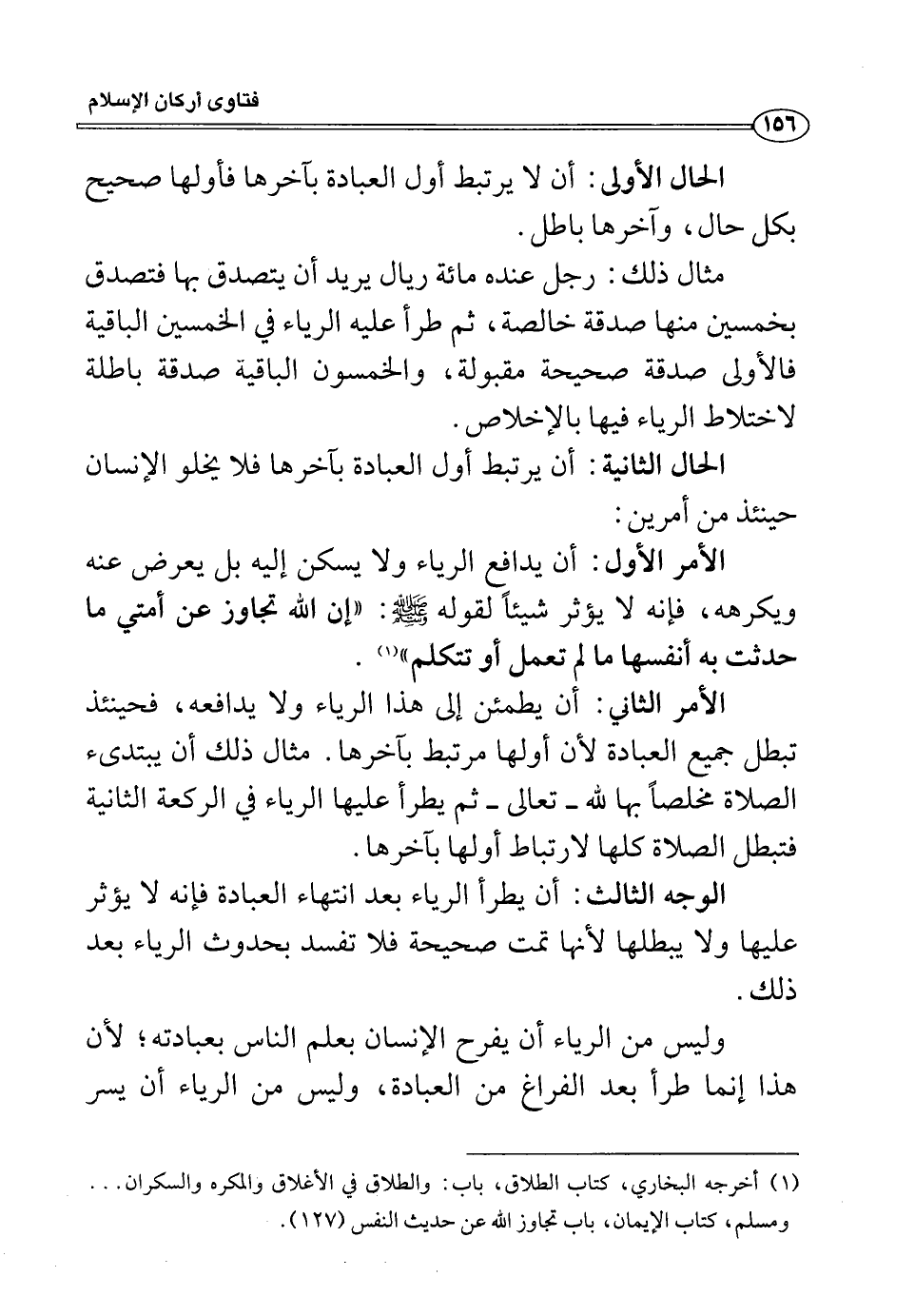الأمر الثاني: أن يطمئن إلى هذا الرياء ولا يدافعه، فحينئذ تبطل جميع العبادة لأن أولها مرتبط بآخرها. مثال ذلك أن يبتدئ الصلاة مخلصاً بها لله -تعالى- ثم يطرأ عليها الرياء في الركعة الثانية فتبطل الصلاة كلها لارتباط أولها بآخرها.