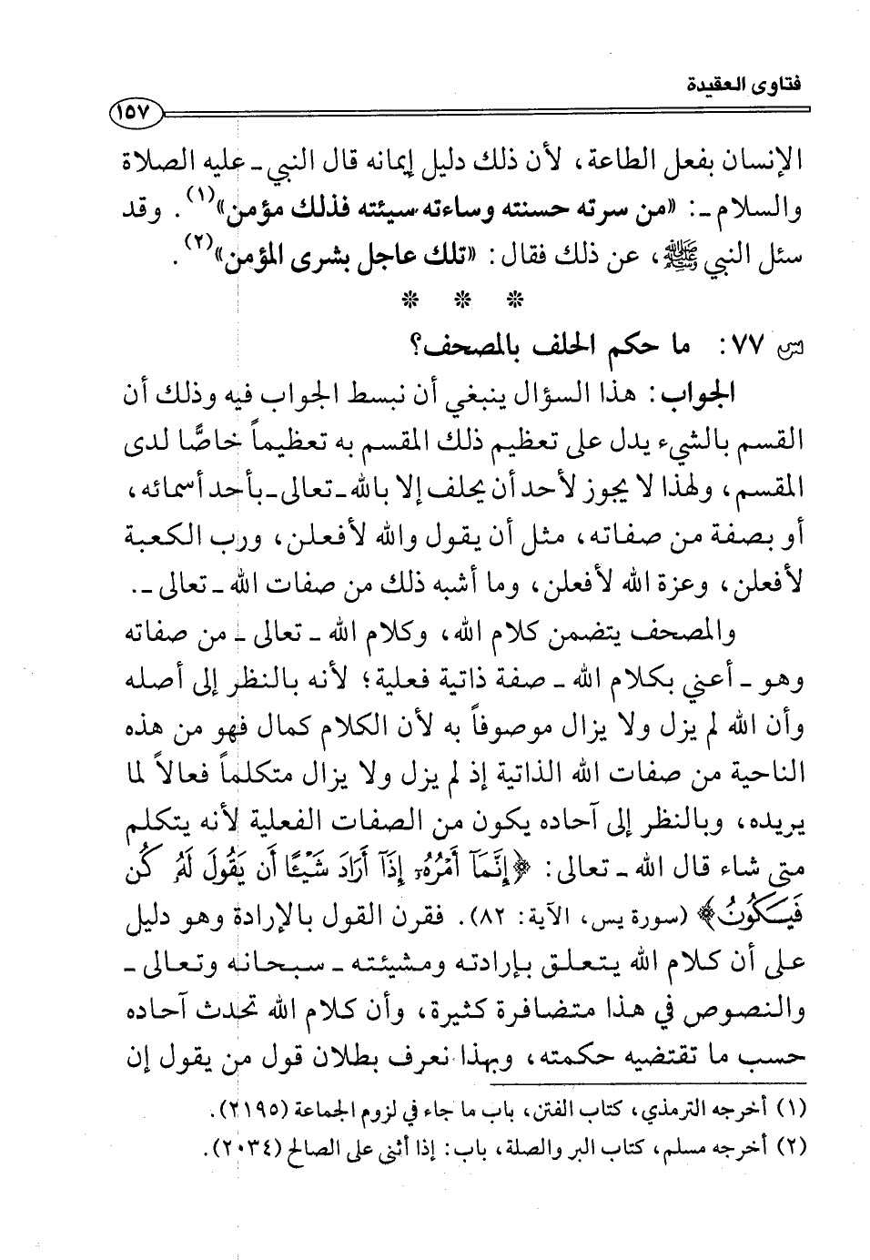 والمصحف يتضمن كلام الله، وكلام الله -تعالى- من صفاته وهو -أعني بكلام الله- صفة ذاتية فعلية، لأنه بالنظر إلى أصله وأن الله لم يزل ولا يزال موصوفاً به لأن الكلام كمال فهو من هذه الناحية من صفات الله الذاتية إذ لم يزل ولا يزال متكلماً فعالاً لما يريده، وبالنظر إلى آحاده يكون من الصفات الفعلية لأنه يتكلم متى شاء قال الله -تعالى-: (إِنَّمَا أَمْرُهُ إِذَا أَرَادَ شَيْئاً أَنْ يَقُولَ لَهُ كُنْ فَيَكُونُ) (يّس: 82) فقرن القول بالإرادة وهو دليل على أن كلام الله يتعلق بإرادته ومشيئته -سبحانه وتعالى- والنصوص في هذا متضافرة كثيرة، وأن كلام الله تحدث آحاده حسب ما تقتضيه حكمته، وبهذا نعرف بطلان قول من يقول إن