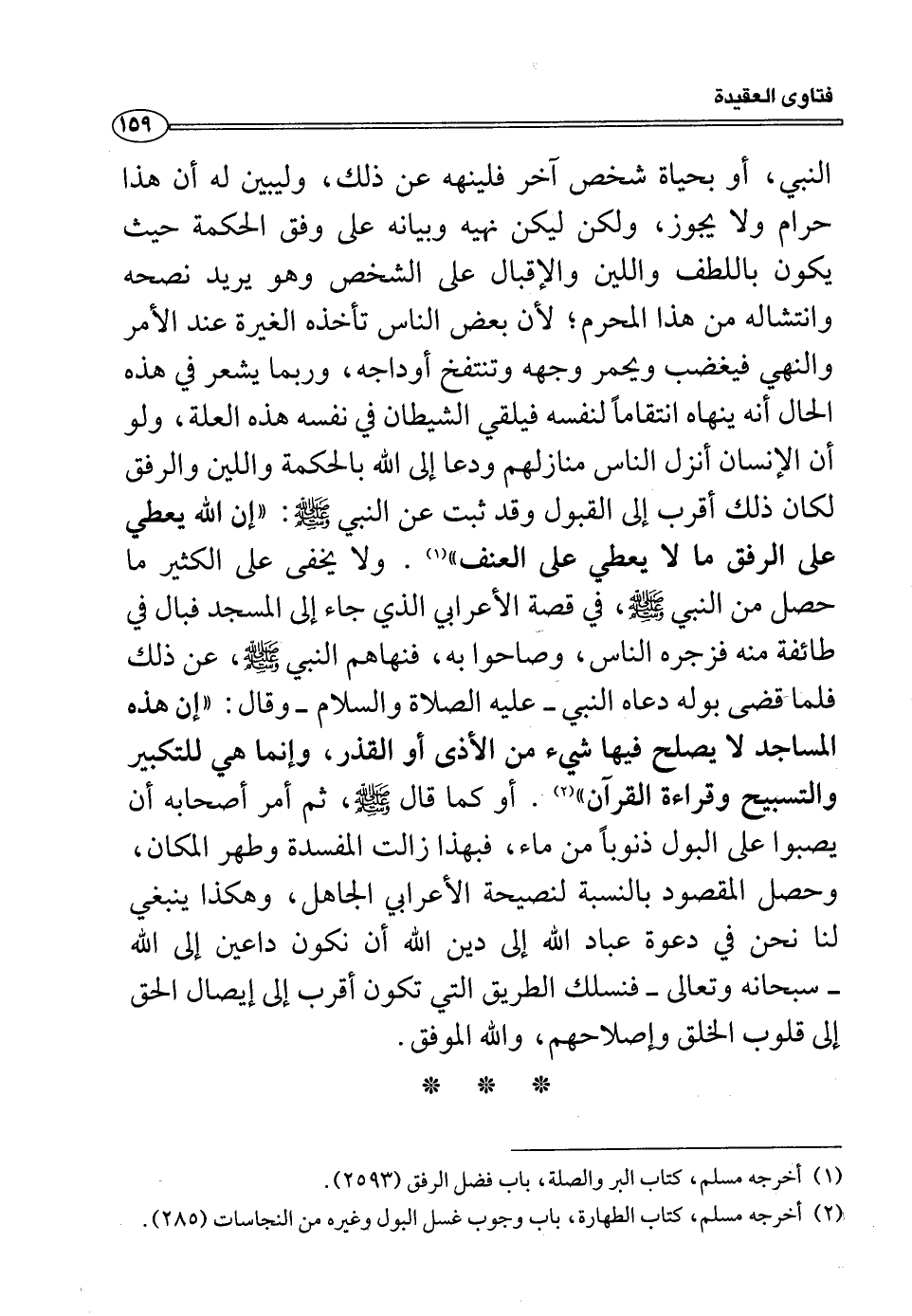 النبي، أو بحياة شخص آخر فلينهه عن ذلك، وليبين له أن هذا حرام ولا يجوز، ولكن ليكن نهيه وبيانه على وفق الحكمة حيث يكون باللطف واللين والإقبال على الشخص وهو يريد نصحه وانتشاله من هذا المحرم، لأن بعض الناس تأخذه الغيرة عند الأمر والنهي فيغضب ويحمر وجهه وتنتفخ أوداجه، وربما يشعر في هذه الحال أنه ينهاه انتقاماً لنفسه فيلقي الشيطان في نفسه هذه العلة، ولو أن الإنسان أنزل الناس منازلهم ودعا إلى الله بالحكمة واللين والرفق لكان ذلك أقرب إلى القبول وقد ثبت عن النبي صلى الله عليه وسلم: ((إن الله يعطي على الرفق ما لا يعطي على العنف)) (¬1) ولا يخفى على الكثير ما حصل من النبي صلى الله عليه وسلم، في قصة الأعرابي الذي جاء إلى المسجد فبال في طائفة منه فزجره الناس، وصاحوا به، فنهاهم النبي صلى الله عليه وسلم، عن ذلك فلما قضى بوله دعاه النبي -عليه الصلاة والسلام- وقال: ((إن هذه المساجد لا يصلح فيها شيء من الأذى أو الذر، وإنما هي للتكبير والتسبيح وقراءة القرآن)) (¬2) أو كما قال صلى الله عليه وسلم، ثم أمر أصحابه أن يصبوا على البول ذنوباً من ماء، فبهذا زالت المفسدة وطهر المكان، وحصل المقصود بالنسبة لنصيحة الأعرابي الجاهل، وهكذا ينبغي لنا نحن في دعوة عباد الله إلى دين الله أن نكون داعين إلى الله -سبحانه وتعالى- فنسلك الطريق التي تكون أقرب إلى إيصال الحق إلى قلوب الخلق وإصلاحهم، والله الموفق.