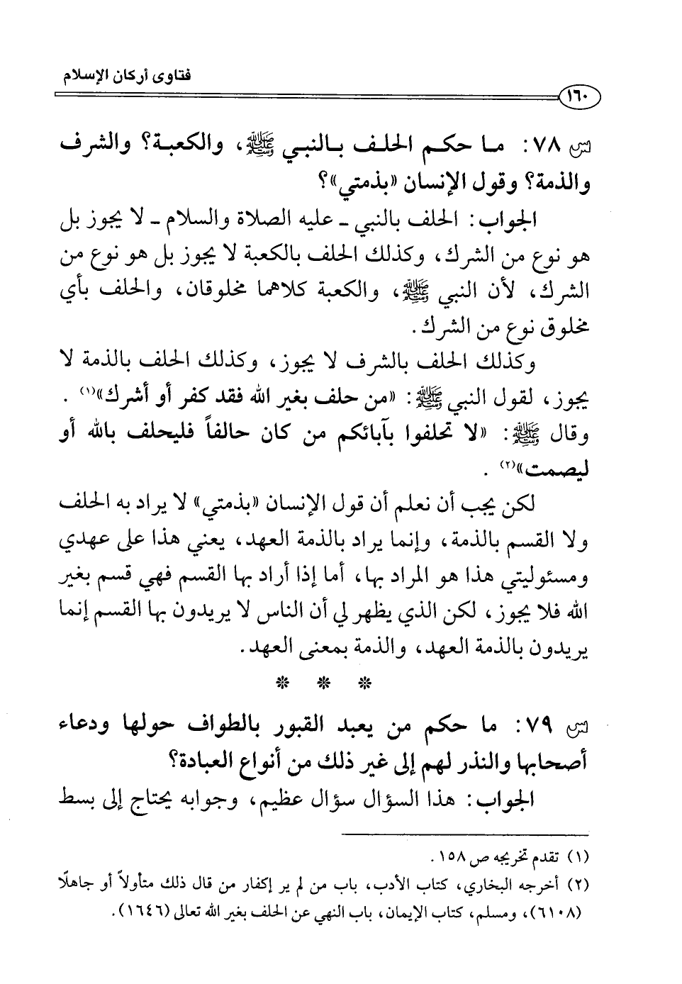 لكن يجب أن نعلم أن قول الإنسان ((بذمتي)) لا يراد به الحلف ولا القسم بالذمة، وإنما يراد بالذمة العهد، يعني هذا على عهدي ومسئوليتي هذا هو المراد بها، أما إذا أراد بها القسم فهي قسم بغير الله فلا يجوز، لكن الذي يظهر لي أن الناس لا يريدون بها القسم إنما يريدون بالذمة العهد، والذمة بمعنى العهد.