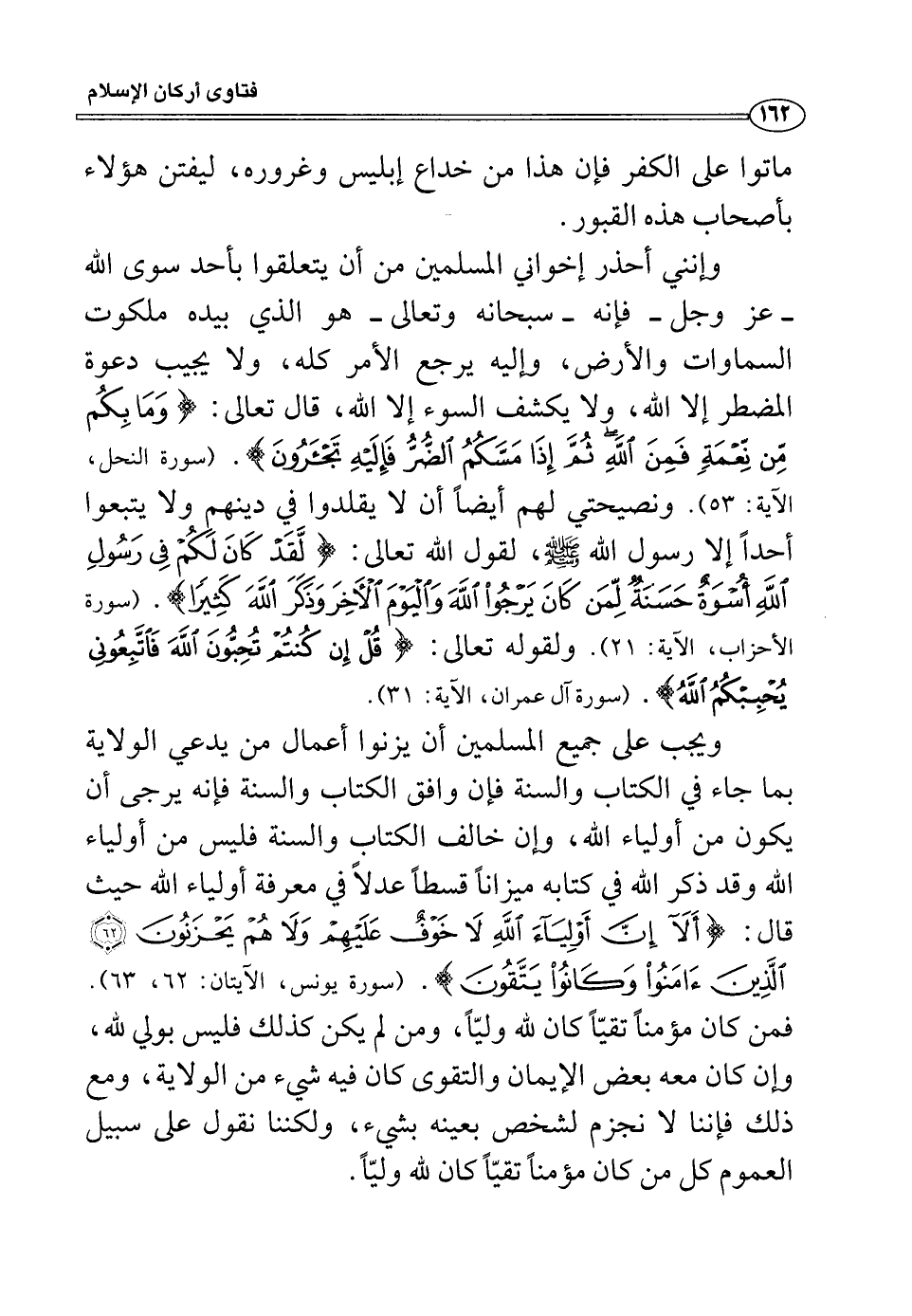 وإنني أحذر إخواني المسلمين من أن يتعلقوا بأحد سوى الله -عز وجل- فإنه -سبحانه وتعالى- هو الذي بيده ملكوت السماوات والأرض، وإليه يرجع الأمر كله، ولا يجيب دعوة المضطر إلا الله، ولا يكشف السوء إلا الله، قال تعالى: (وَمَا بِكُمْ مِنْ نِعْمَةٍ فَمِنَ اللَّهِ ثُمَّ إِذَا مَسَّكُمُ الضُّرُّ فَإِلَيْهِ تَجْأَرُونَ) (النحل: 53) ونصيحتي لهم أيضاً أن لا يقلدوا في دينهم ولا يتبعوا أحداً إلا رسول الله صلى الله عليه وسلم، لقول الله تعالى: (لَقَدْ كَانَ لَكُمْ فِي رَسُولِ اللَّهِ أُسْوَةٌ حَسَنَةٌ لِمَنْ كَانَ يَرْجُو اللَّهَ وَالْيَوْمَ الْآخِرَ وَذَكَرَ اللَّهَ كَثِيراً) (الأحزاب: 21) ولقوله تعالى: (قُلْ إِنْ كُنْتُمْ تُحِبُّونَ اللَّهَ فَاتَّبِعُونِي يُحْبِبْكُمُ اللَّهُ) . (آل عمران: من الآية31) .