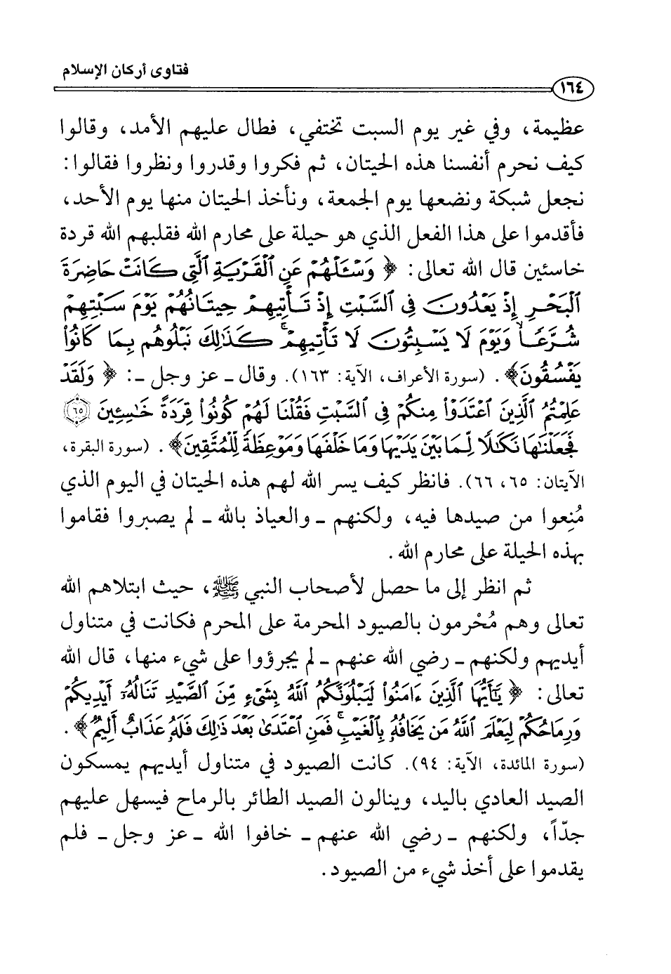 عظيمة، وفي غير يوم السبت تختفي، فطال عليهم الأمد، وقالوا كيف نحرم أنفسنا هذه الحيتان، ثم فكروا وقدروا ونظروا فقالوا: نجعل شبكة ونضعها يوم الجمعة، ونأخذ الحيتان منها يوم الأحد، فأقدموا على هذا الفعل الذي هو حيلة على محارم الله فقلبهم الله قردة خاسئين قال الله تعالى: (وَاسْأَلْهُمْ عَنِ الْقَرْيَةِ الَّتِي كَانَتْ حَاضِرَةَ الْبَحْرِ إِذْ يَعْدُونَ فِي السَّبْتِ إِذْ تَأْتِيهِمْ حِيتَانُهُمْ يَوْمَ سَبْتِهِمْ شُرَّعاً وَيَوْمَ لا يَسْبِتُونَ لا تَأْتِيهِمْ كَذَلِكَ نَبْلُوهُمْ بِمَا كَانُوا يَفْسُقُونَ) (لأعراف: 163) وقال -عز وجل-: (وَلَقَدْ عَلِمْتُمُ الَّذِينَ اعْتَدَوْا مِنْكُمْ فِي السَّبْتِ فَقُلْنَا لَهُمْ كُونُوا قِرَدَةً خَاسِئِينَ) (البقرة: 65) (فَجَعَلْنَاهَا نَكَالاً لِمَا بَيْنَ يَدَيْهَا وَمَا خَلْفَهَا وَمَوْعِظَةً لِلْمُتَّقِينَ) (البقرة: 66) فانظر كيف يسر الله