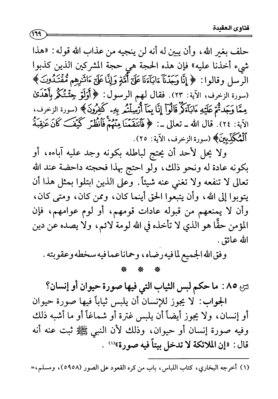 س85: ما حكم لبس الثياب التي فيها صورة حيوان أو إنسان؟
