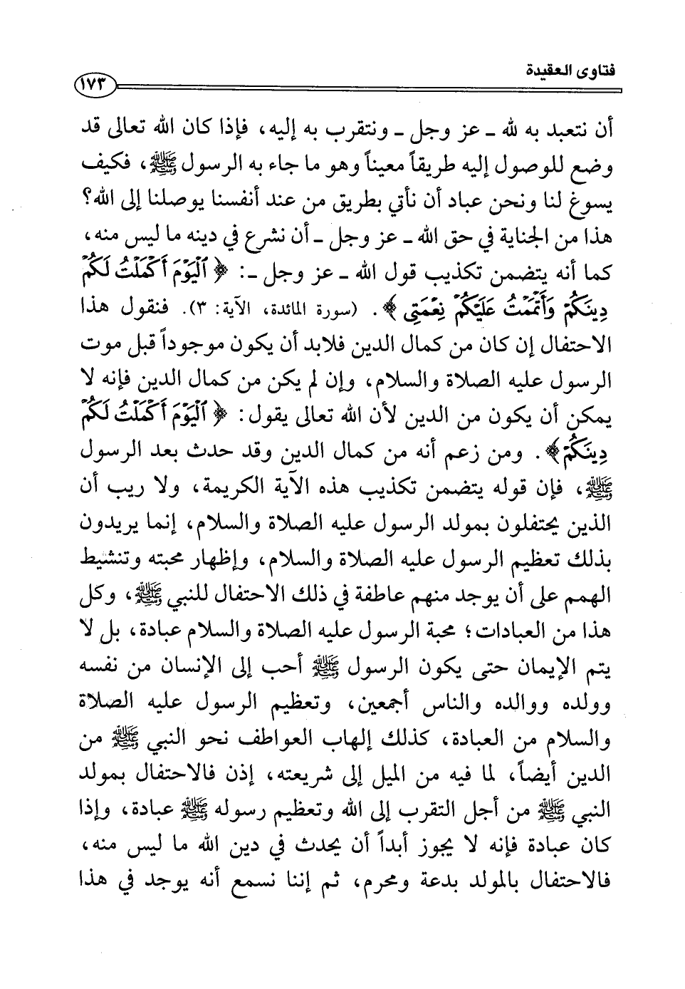 أن نتعبد به لله -عز وجل- ونتقرب به إليه، فإذا كان الله تعالى قد وضع للوصول إليه طريقاً معيناً وهو ما جاء به الرسول صلى الله عليه وسلم، فكيف يسوغ لنا ونحن عباد أن نأتي بطريق من عند أنفسنا يوصلنا إلى الله؟ هذا من الجناية في حق الله -عز وجل- أن نشرع فيدينه ما ليس منه، كما أنه يتضمن تكذيب قول الله -عز وجل-: (الْيَوْمَ أَكْمَلْتُ لَكُمْ دِينَكُمْ وَأَتْمَمْتُ عَلَيْكُمْ نِعْمَتِي) (المائدة: من الآية3) فنقول هذا الاحتفال إن كان من كمال الدين فلا بد أن يكون موجوداً قبل موت الرسول عليه الصلاة والسلام، وإن لم يكن من كمال الدين فإنه لا يمكن أن يكون من الدين لأن الله تعالى يقول: (الْيَوْمَ أَكْمَلْتُ لَكُمْ دِينَكُمْ) (المائدة: من الآية3) ومن زعم أنه من كمال الدين وقد حدث بعد الرسول صلى الله عليه وسلم، فإن قوله يتضمن تكذيب هذه الآية الكريمة، ولا ريب أن الذين يحتفلون بمولد الرسول عليه الصلاة والسلام إنما يريدون بذلك تعظيم الرسول عليه الصلاة والسلام، وإظهار محبته وتنشيط الهمم على أن يوجد منهم عاطفة في ذلك الاحتفال للنبي صلى الله عليه وسلم، وكل هذا من العبادات، محبة الرسول عليه الصلاة والسلام عبادة، بل لا يتم الإيمان حتى يكون الرسول صلى الله عليه وسلم أحب إلى الإنسان من نفسه