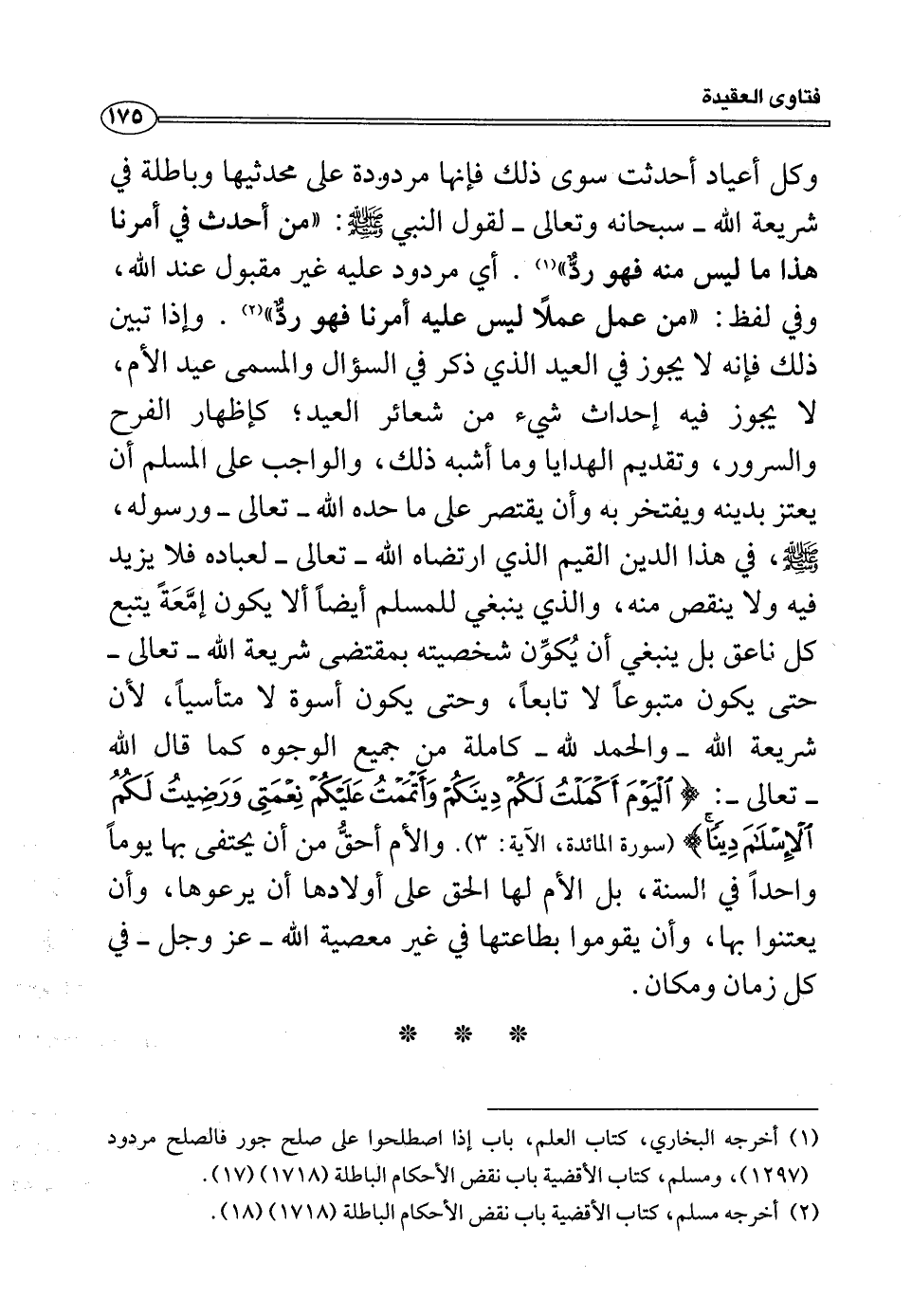 وكل أعياد أحدثت سوى ذلك فإنها مردودة على محدثيها وباطلة في شريعة الله -سبحانه وتعالى- لقول النبي صلى الله عليه وسلم: ((من أحدث في أمرنا هذا ما ليس منه فهو ردٌ)) (¬1) أي مردود عليه غير مقبول عند الله، وفي لفظ: ((من عمل عملاً ليس عليه أمرنا فهو رد)) (¬2) وإذا تبين ذلك فإنه لا يجوز في العيد الذي ذكر في السؤال والمسمى عيد الأم، لا يجوز فيه إحداث شيء من شعائر العيد، كإظهار الفرح والسرور، وتقديم الهدايا وما أشبه ذلك، والواجب على المسلم أن يعتز بدينه ويفتخر به وأن يقتصر على ما حده الله -تعالى- ورسوله، صلى الله عليه وسلم، في هذا الدين القيم الذي ارتضاه الله -تعالى- لعباده فلا يزيد فيه ولا ينقص منه، والذي ينبغي للمسلم أيضاً ألا يكون إمعة يتبع كل ناعق بل ينبغي أن يكون شخصيته بمقتضى شريعة الله -تعالى- حتى يكون متبوعاً لا تابعاً، وحتى يكون أسوة لا متأسياً، لأن شريعة الله -والحمد لله- كاملة من جميع الوجوه كما قال الله -تعالى-: (الْيَوْمَ أَكْمَلْتُ لَكُمْ دِينَكُمْ وَأَتْمَمْتُ عَلَيْكُمْ نِعْمَتِي وَرَضِيتُ لَكُم الإسلَامَ دِينَا) (المائدة: الآية3) والأم أحق من أن يحتفى بها يومأً واحداً في السنة، بل الأم لها الحق على أولادها أن يرعوها، وأن يعتنوا بها، وأن يقوموا بطاعتها في غير معصية الله -عز وجل- في كل زمان ومكان.