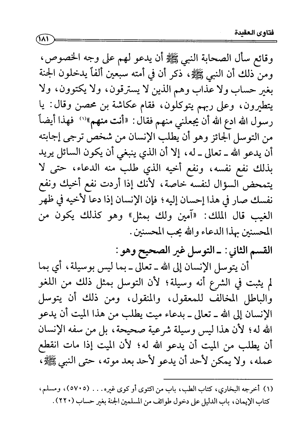 وقائع سأل الصحابة النبي صلى الله عليه وسلم أن يدعو لهم على وجه الخصوص، ومن ذلك أن النبي صلى الله عليه وسلم، ذكر أن في أمته سبعين ألفاً يدخلون الجنة بغير حساب ولا عذاب وهم الذين لا يسترقون، ولا يكتوون، ولا يتطيرون، وعلى ربهم يتوكلون، فقام عكاشة بن محصن وقال: يا رسول الله ادع الله أن يجعلني منهم فقال: ((أنت منهم)) (¬1) فهذا أيضاً من التوسل الجائز وهو أن يطلب الإنسان من شخص ترجى إجابته أن يدعو الله -تعالى- له، إلا أن الذي ينبغي أن يكون السائل يريد بذلك نفع نفسه، ونفع أخيه الذي طلب منه الدعاء، حتى لا يتمحض السؤال لنفسه خاصة، لأنك إذا أردت نفع أخيك ونفع نفسك صار في هذا إحسان إليه، فإن الإنسان إذا دعا لأخيه في ظهر الغيب قال الملك: "آمين ولك بمثل" وهو كذلك يكون من المحسنين بهذا الدعاء والله يحب المحسنين.