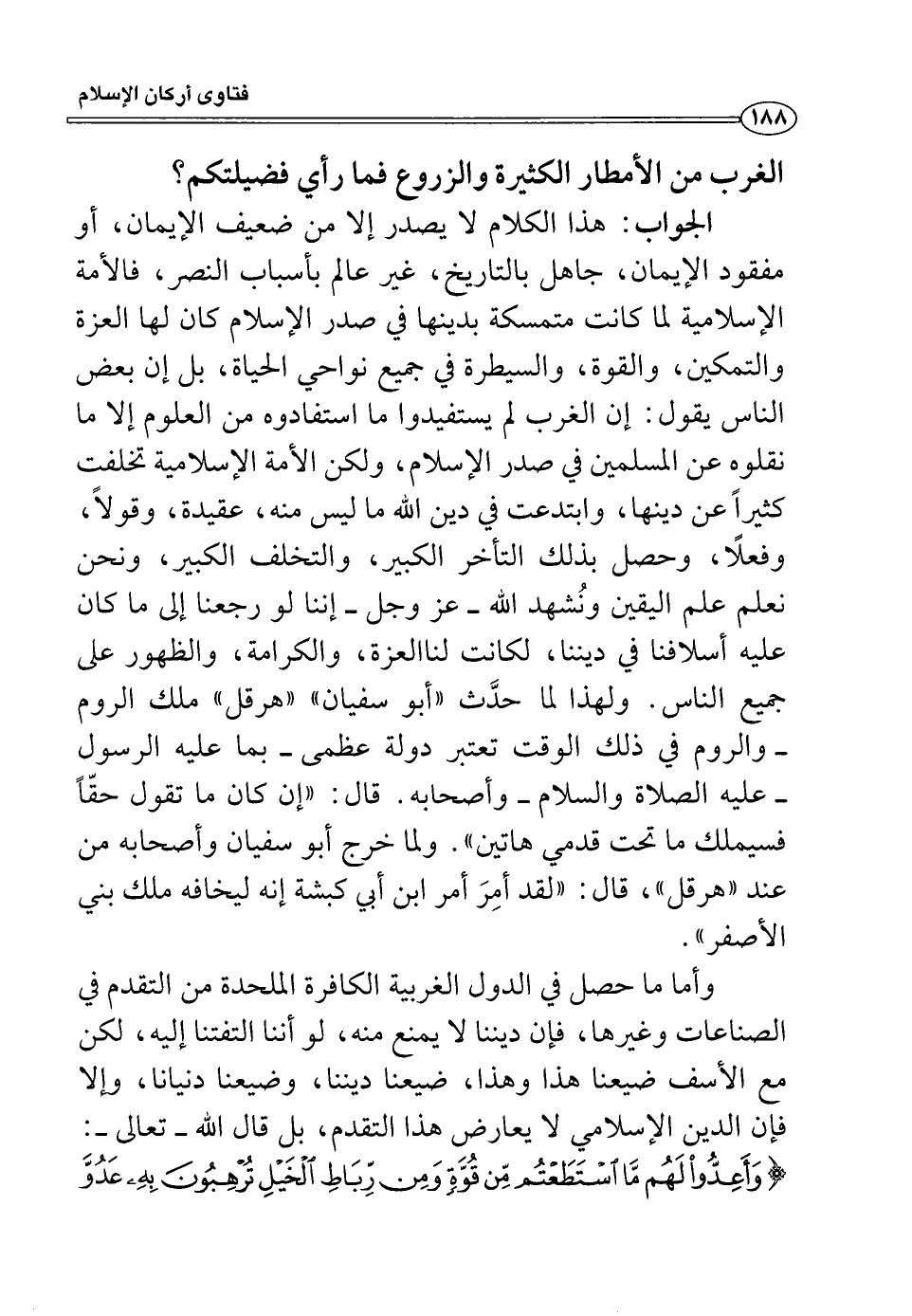 وأما ما حصل في الدول الغربية الكافرة الملحدة من التقدم في الصناعات وغيرها، فإن ديننا لا يمنع منه، لو أننا التفتنا إليه، لكن مع الأسف ضيعنا هذا وهذا، ضيعنا ديننا، وضيعنا دنيانا، وإلا فإن الدين الإسلامي لا يعارض هذا التقدم، بل قال الله -تعالى-: (وَأَعِدُّوا لَهُمْ مَا اسْتَطَعْتُمْ مِنْ قُوَّةٍ وَمِنْ رِبَاطِ الْخَيْلِ تُرْهِبُونَ بِهِ عَدُوَّ