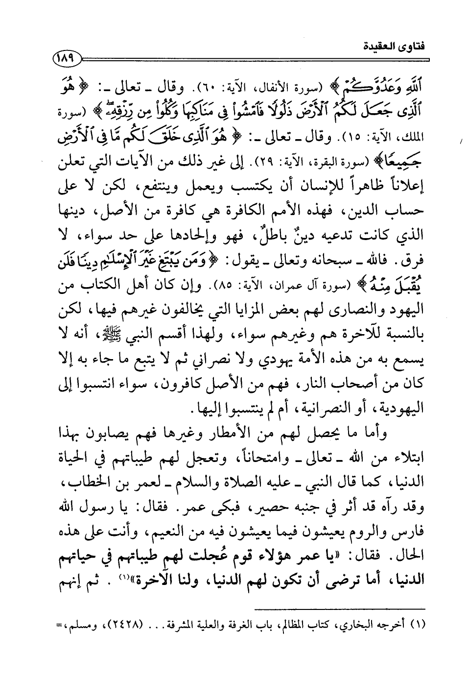 اللَّهِ وَعَدُوَّكُمْ) (لأنفال: من الآية60) وقال -تعالى-: (هُوَ الَّذِي جَعَلَ لَكُمُ الْأَرْضَ ذَلُولاً فَامْشُوا فِي مَنَاكِبِهَا وَكُلُوا مِنْ رِزْقِهِ) (الملك: من الآية15) وقال -تعالى-: (هُوَ الَّذِي خَلَقَ لَكُمْ مَا فِي الْأَرْضِ جَمِيعاً) (البقرة: من الآية29) إلى غير ذلك من الآيات التي تعلم إعلاناً ظاهراً للإنسان أن يكتسب ويعمل وينتفع، لكن لا على حساب الدين، فهذه الأمم الكافرة هي كافرة من الأصل، دينها الذي كانت تدعيه دينٌ باطلٌ، فهو وإلحادها على حد سواء، لا فرق. فالله -سبحانه وتعالى- يقول: (وَمَنْ يَبْتَغِ غَيْرَ الْأِسْلامِ دِيناً فَلَنْ يُقْبَلَ مِنْهُ) (آل عمران: من الآية85) . وإن كان أهل الكتاب من اليهود والنصارى لهم بعض المزايا التي يخالفون غيرهم فيها، لكن بالنسبة للآخرة هم وغيرهم سواء، ولهذا أقسم النبي صلى الله عليه وسلم، أنه لا يسمع به من هذه الأمة يهودي ولا نصراني ثم لا يتبع ما جاء به إلا كان من أصحاب النار، فهم في الأصل كافرون، سواء انتسبوا إلى اليهودية، أو النصرانية، أم لم ينتسبوا إليها.
