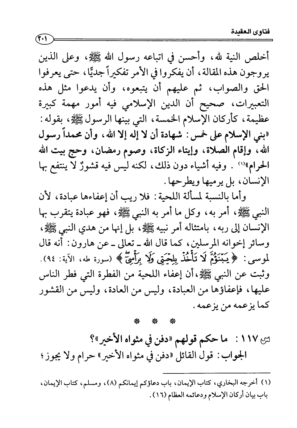أخلص النية لله، وأحسن في اتباعه رسول الله صلى الله عليه وسلم، وعلى الذين يروجون هذه المقالة، أن يفكروا في الأمر تفكيراً جدياً، حتى يعرفوا الحق والصواب، ثم عليهم أن يتبعوه، وأن يدعوا مثل هذه التعبيرات، صحيح أن الدين الإسلامي فيه أمور مهمة كبيرة عظيمة، كأركان الإسلام الخمسة، التي بينها الرسول صلى الله عليه وسلم، بقوله: ((بني الإسلام على خمس: شهادة أن لا إله إلا الله، وأن محمداً رسول الله، وإقام الصلاة، وإيتاء الزكاة، وصوم رمضان، وحج البيت الحرام)) (¬1) وفيه أشياء دون ذلك، لكنه ليس فيه قشور لا ينتفع بها الإنسان، بل يرميها ويطرحها.