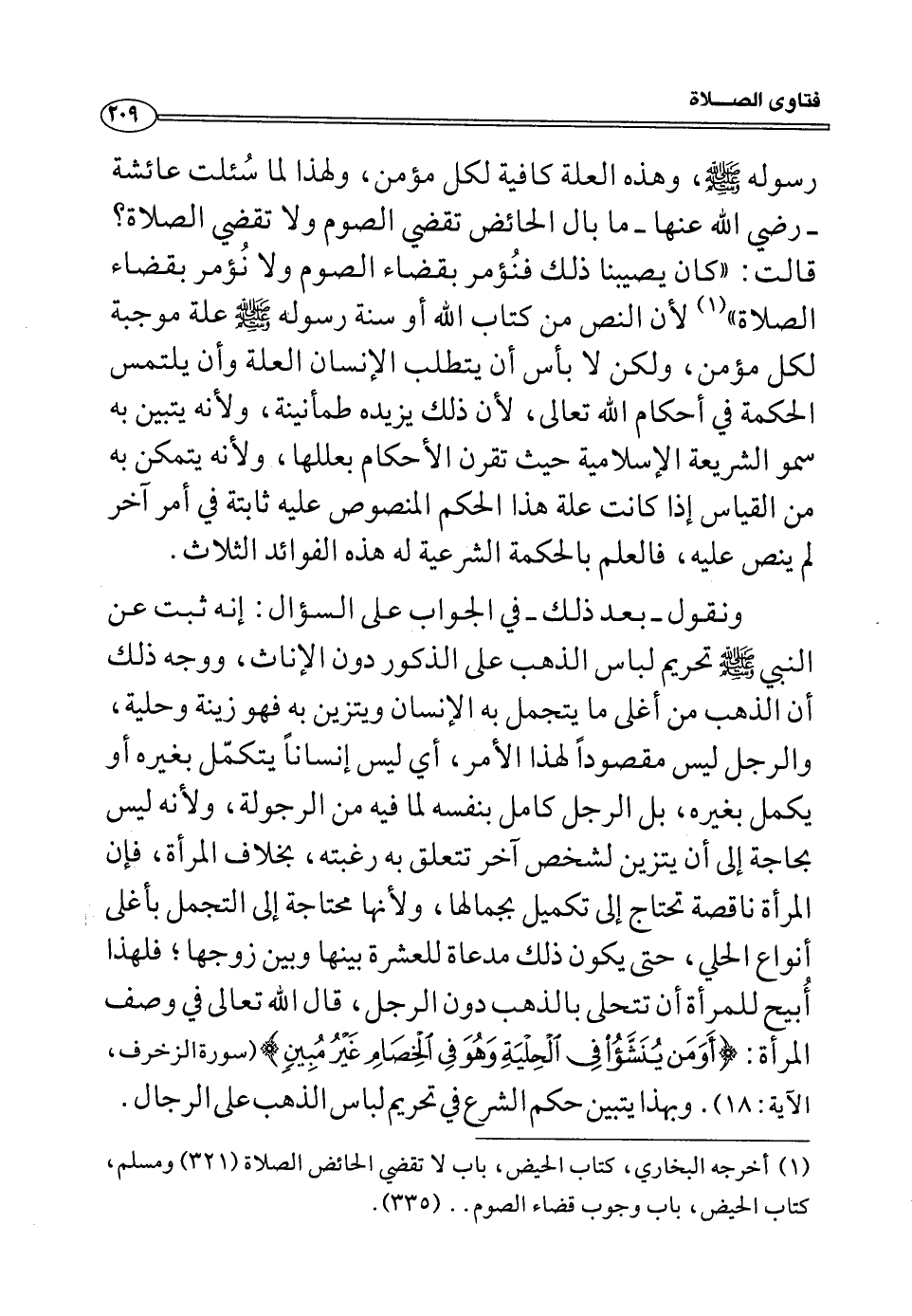 رسوله صلى الله عليه وسلم، وهذه العلة كافية لكل مؤمن، ولهذا لما سئلت عائشة -رضي الله عنها- ما بال الحائض تقضي الصوم ولا تقضي الصلاة؟ قال: ((كان يصيبنا ذلك فنؤمر بقضاء الصوم ولا نؤمر بقضاء الصلاة)) (¬1) لأن النص من كتاب الله أو سنة رسول الله صلى الله عليه وسلم علة موجبة لكل مؤمن، ولكن لا بأس أن يتطلب الإنسان العلة وأن يلتمس الحكمة في أحكام الله تعالى، لأن ذلك يزيده طمأنينة، ولأنه يتبين به سمو الشريعة الإسلامية حيث تقرن الأحكام بعللها، ولأنه يتمكن به من القياس إذا كانت علة هذا الحكم المنصوص عليه ثابتة في أمر آخر لم ينص عليه، فالعلم بالحكمة الشرعية له هذه الفوائد الثلاث.