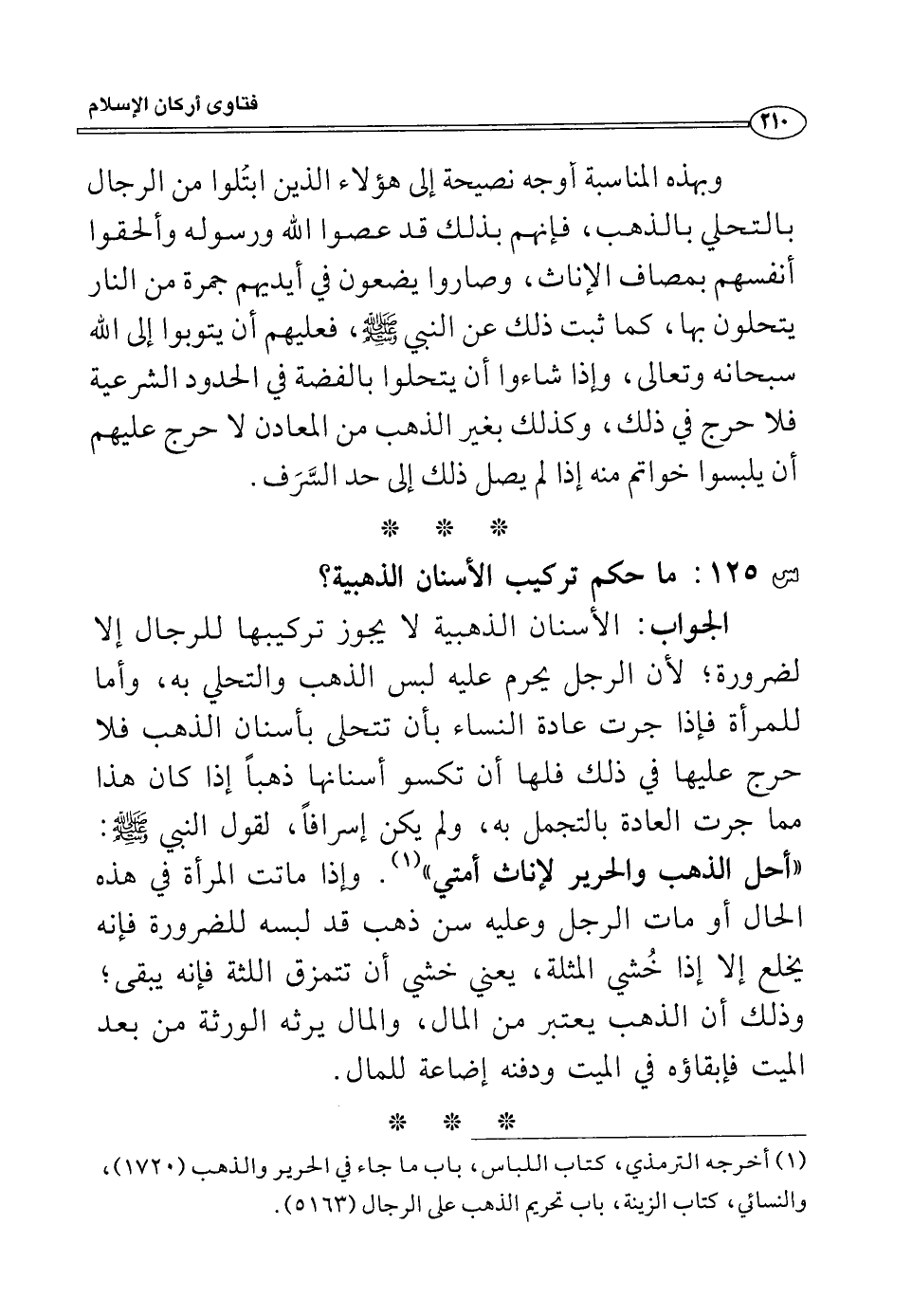 وبهذه المناسبة أوجه نصيحة إلى هؤلاء الذين ابتلوا من الرجال بالتحلي بالذهب، فإنهم بذلك قد عصوا الله ورسوله وألحقوا أنفسهم بمصاف الإناث، وصاروا يضعون في أيديهم جمرة من النار يتحلون بها، كما ثبت ذلك عن النبي صلى الله عليه وسلم فعليهم، أن يتوبوا إلى الله سبحانه وتعالى، وإذا شاءوا أن يتحلوا بالفضة في الحدود الشرعية فلا حرج في ذلك، وكذلك بغير الذهب من المعادن لا حرج عليهم أن يلبسوا خواتم منه إذا لم يصل ذلك إلى حد السرف.