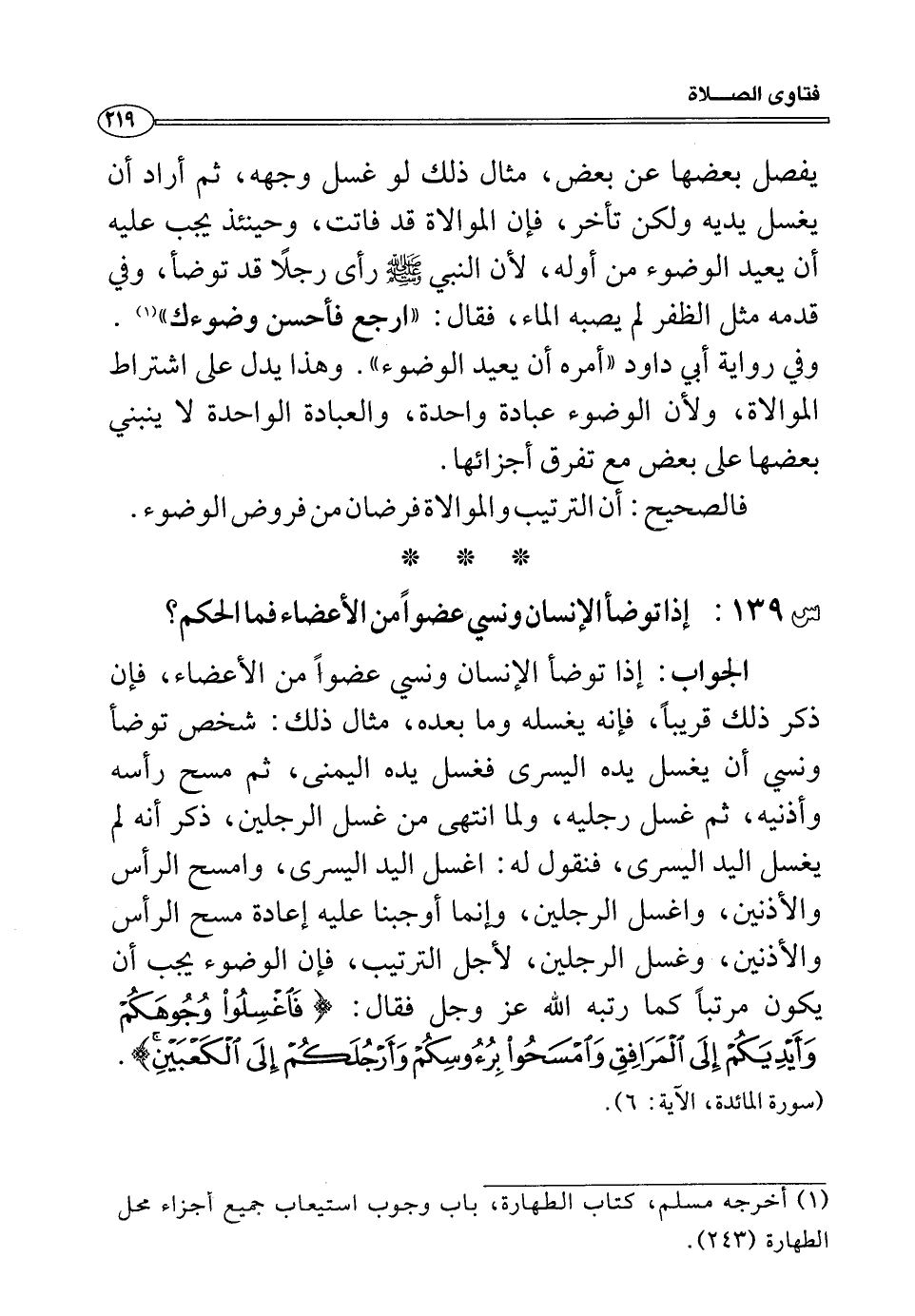 س139: إذا توضأ الإنسان ونسي عضواً من الأعضاء فما الحكم؟