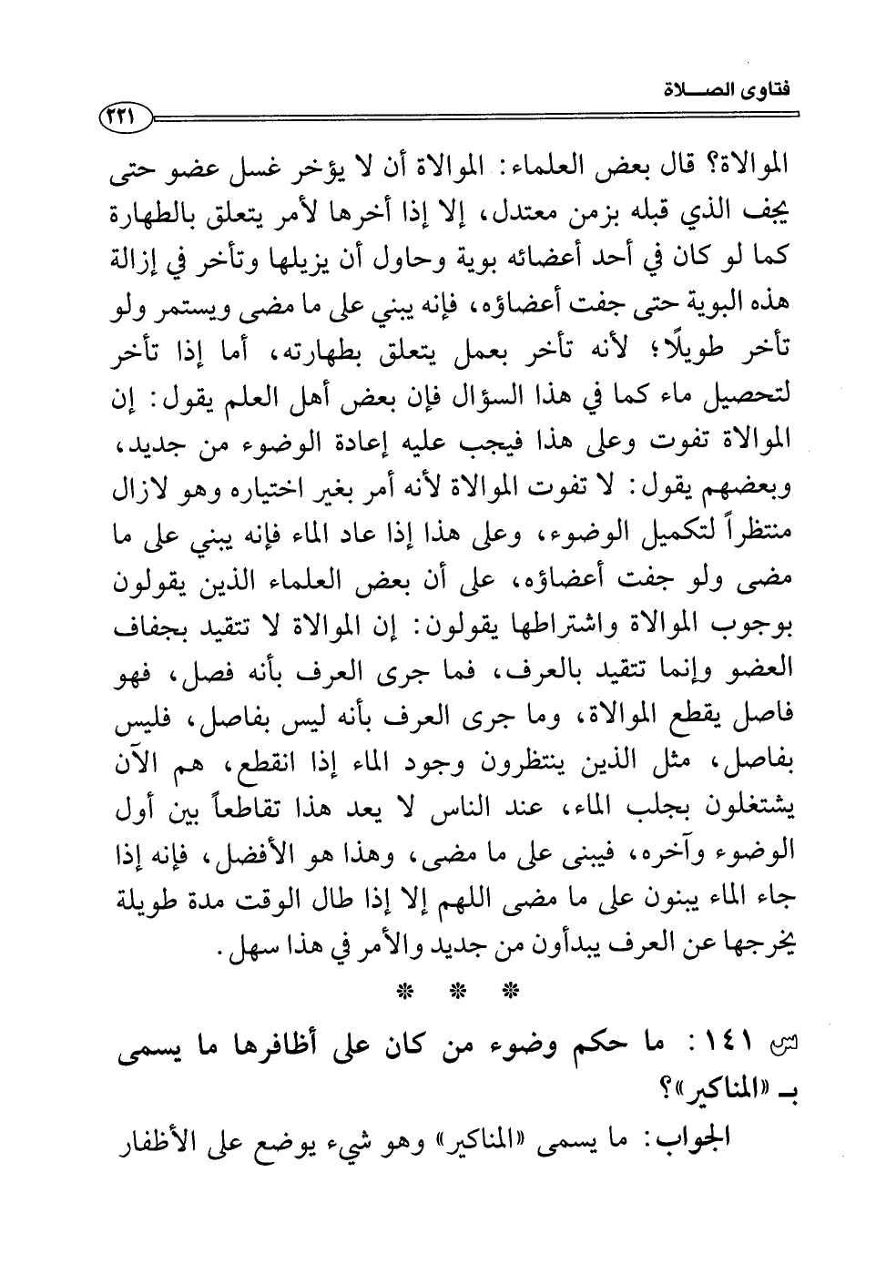 الموالاة؟ قال بعض العلماء: الموالاة أن لا يؤخر غسل عضو حتى يجف الذي قبله بزمن معتدل، إلا إذا أخرها لأمر يتعلق بالطهارة كما لو كان في أحد أعضائه بوية وحاول أن يزيلها وتأخر في إزالة هذه البوية حتى جفت أعضاؤه، فإنه يبني على ما مضى ويستمر ولو تأخر طويلاً، لأنه تأخر بعمل يتعلق بطهارته، أما إذا تأخر لتحصيل ماء كماك في هذا السؤال فإن بعض أهل العلم يقول: إن الموالاة تفوت وعلى هذا فيجب عليه إعادة الوضوء من جديد، وبعضهم يقول: لا تفوت الموالاة لأنه أمر بغير اختياره وهو لا زال منتظراً لتكميل الوضوء، وعلى هذا إذا عاد الماء فإنه يبني على ما مضى ولو جفت أعضاؤه، على أن بعض العلماء الذين يقولون بوجوب الموالاة واشتراطها يقولون: إن الموالاة لا تتقيد بجفاف العضو وإنما تتقيد بالعرف، فما جرى العرف بأنه فصل، فهو فاصل يقطع الموالاة، وما جرى العرف بأنه ليس بفاصل، فليس بفاصل، مثل الذين ينتظرون وجود الماء إذا انقطع، هم الآن يشتغلون بجلب الماء، عند الناس لا يعد هذا تقاطعاً بين أول الوضوء وآخره، فيبنى على ما مضى، وهذا هو الأفضل، فإنه إذا جاء الماء يبنون على ما مضى اللهم إلا إذا طال الوقت مدة طويلة يخرجها عن العرف يبدؤون من جديد والأمر في هذا سهل.