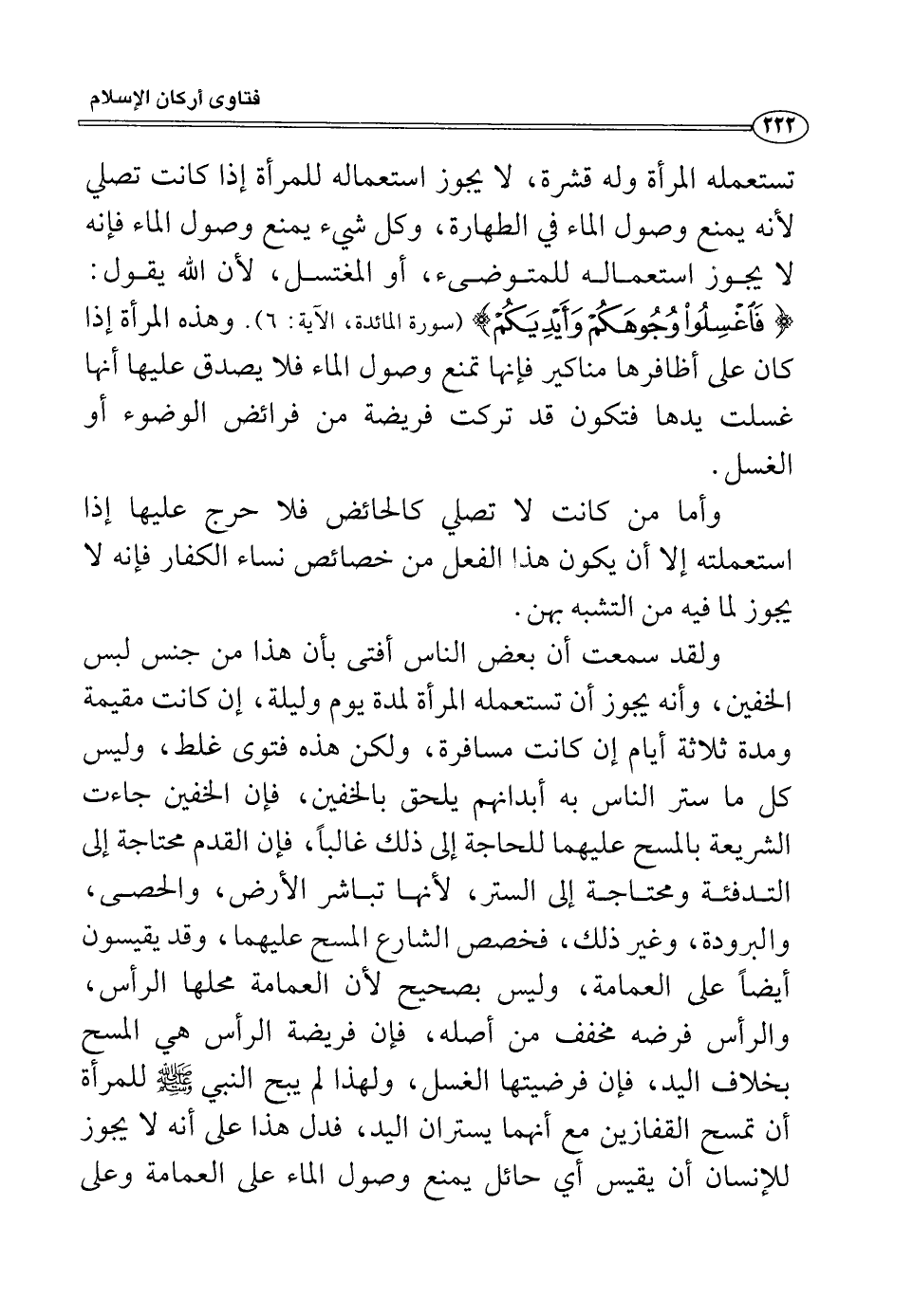 ولقد سمعت أن بعض الناس أفتى بأن هذا من جنس لبس الخفين، وأنه يجوز أن تستعمله المرأة لمدة يوم وليلة، إن كانت مقيمة ومدة ثلاثة أيام إن كانت مسافرة، ولكن هذه فتوى غلط، وليس كل ما ستر الناس به أبدانهم يلحق بالخفين، فإن الخفين جاءت الشريعة بالمسح عليهما للحاجة إلى ذلك غالباً، فإن القدم محتاجة إلى التدفئة ومحتاجة إلى الستر، لأنها تباشر الأرض، والحصى، والبرودة، وغير ذلك، فخصص الشارع المسح عليهما، وقد يقيسون أيضاً على العمامة، وليس بصحيح لأن العمامة محلها الرأس، والرأس فرضه مخفف من أصله، فإن فريضة الرأس هي المسح بخلاف اليد، فإن فرضيتها الغسل، ولهذا لم يبح النبي صلى الله عليه وسلم للمرأة أن تمسح القفازين مع أنهما يستران اليد، فدل هذا على أنه لا يجوز للإنسان أن يقيس أي حائل يمنع وصول الماء على العمامة وعلى