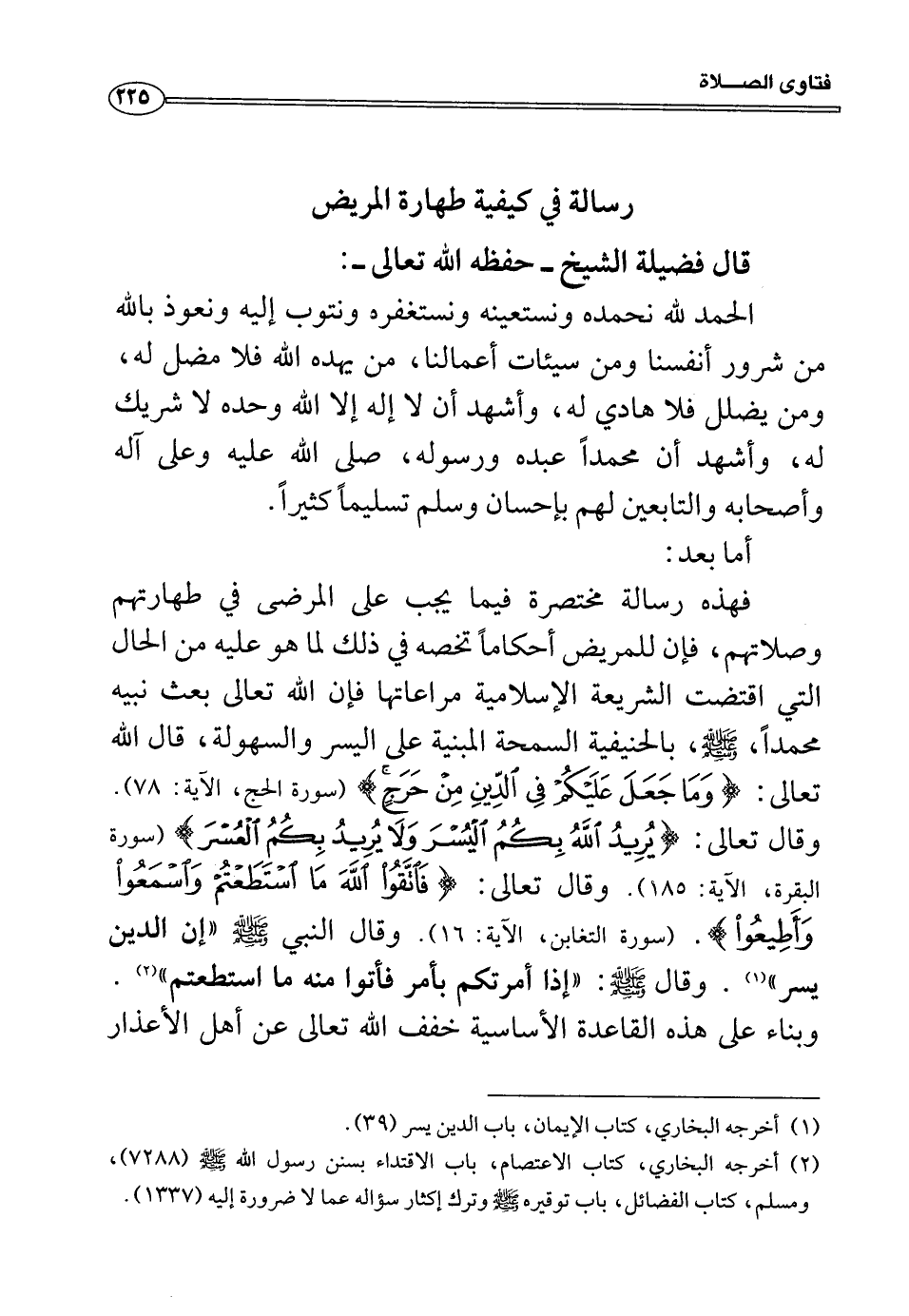 فهذه رسالة مختصر فيما يجب على المرضى في طهارتهم وصلاتهم، فإن للمريض أحكاماً تخصه في ذلك لما هو عليه من الحال التي اقتضت الشريعة الإسلامية مراعاتها فإن الله تعالى بعث نبيه محمداً، صلى الله عليه وسلم، بالحنيفية السمحة المبنية على اليسر والسهولة، قال الله تعالى: (وَمَا جَعَلَ عَلَيْكُمْ فِي الدِّينِ مِنْ حَرَجٍ) (الحج: من الآية78) وقال تعالى: (يُرِيدُ اللَّهُ بِكُمُ الْيُسْرَ وَلا يُرِيدُ بِكُمُ الْعُسْرَ) (البقرة: من الآية185) وقال تعالى: (فَاتَّقُوا اللَّهَ مَا اسْتَطَعْتُمْ وَاسْمَعُوا وَأَطِيعُوا) (التغابن: من الآية16) وقال النبي صلى الله عليه وسلم ((إن الدين يسر)) (¬1) وقال صلى الله عليه وسلم: "إذا أمرتكم بأمر فأتوا منه ما استطعتم" (¬2) . وبناء على هذه القاعدة الأساسية خفف الله تعالى عن أهل الأعذار