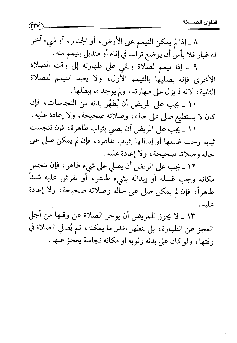 13- لا يجوز للمريض أن يؤخر الصلاة عن وقتها من أجل العجز عن الطهارة، بل يتطهر بقدر ما يمكنه، ثم يصلي الصلاة في وقتها ولو كان على بدنه وثوبه أو مكانه نجاسة يعجز عنها.