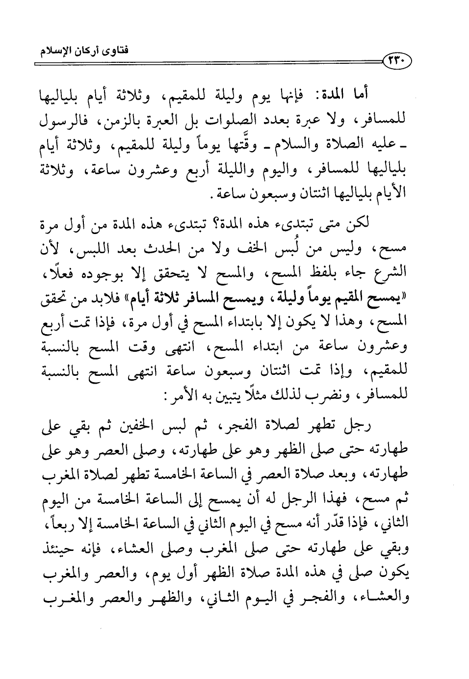 أما المدة: فإنها يوم وليلة للمقيم، وثلاثة أيام بلياليها للمسافر، ولا عبرة بعدد الصلوات بل العبرة بالزمن، فالرسول -عليه الصلاة والسلام- وقتها يوماً وليلة للمقيم، وثلاثة أيام بلياليها للمسافر، واليوم والليلة أربع وعشرون ساعة، وثلاثة الأيام بلياليها اثنتان وسبعون ساعة.