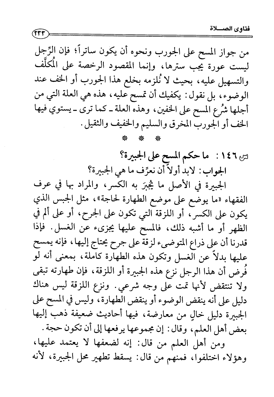 الجبيرة في الأصل ما يجبر به الكسر، والمراد بها في عرف الفقهاء "ما يوضع على موضع الطهارة لحاجة"، مثل الجبس الذي يكون على الكسر، أو اللزقة التي تكون على الجرح، أو على ألم في الظهر أو ما أشبه ذلك، فالمسح عليها يجزئ عن الغسل. فإذا قدرنا أن على ذراع المتوضئ لزقة على جرح يحتاج إليها، فإنه يمسح عليها بدلاً عن الغسل وتكون هذه الطهارة كاملة، بمعنى أنه لو فرض أن هذا الرجل نزع هذه الجبيرة أو اللزقة، فإن طهارته تبقى ولا تنتقض لأنها تمت على وجه شرعي. ونزع اللزقة ليس هناك دليل على أنه ينقض الوضوء أو ينقض الطهارة، وليس في المسح على الجبيرة دليل خالٍ من معارضة، فيها أحاديث ضعيفة ذهب إليها بعض أهل العلم، وقال: إن مجموعها يرفعها إلى أن تكون حجة.