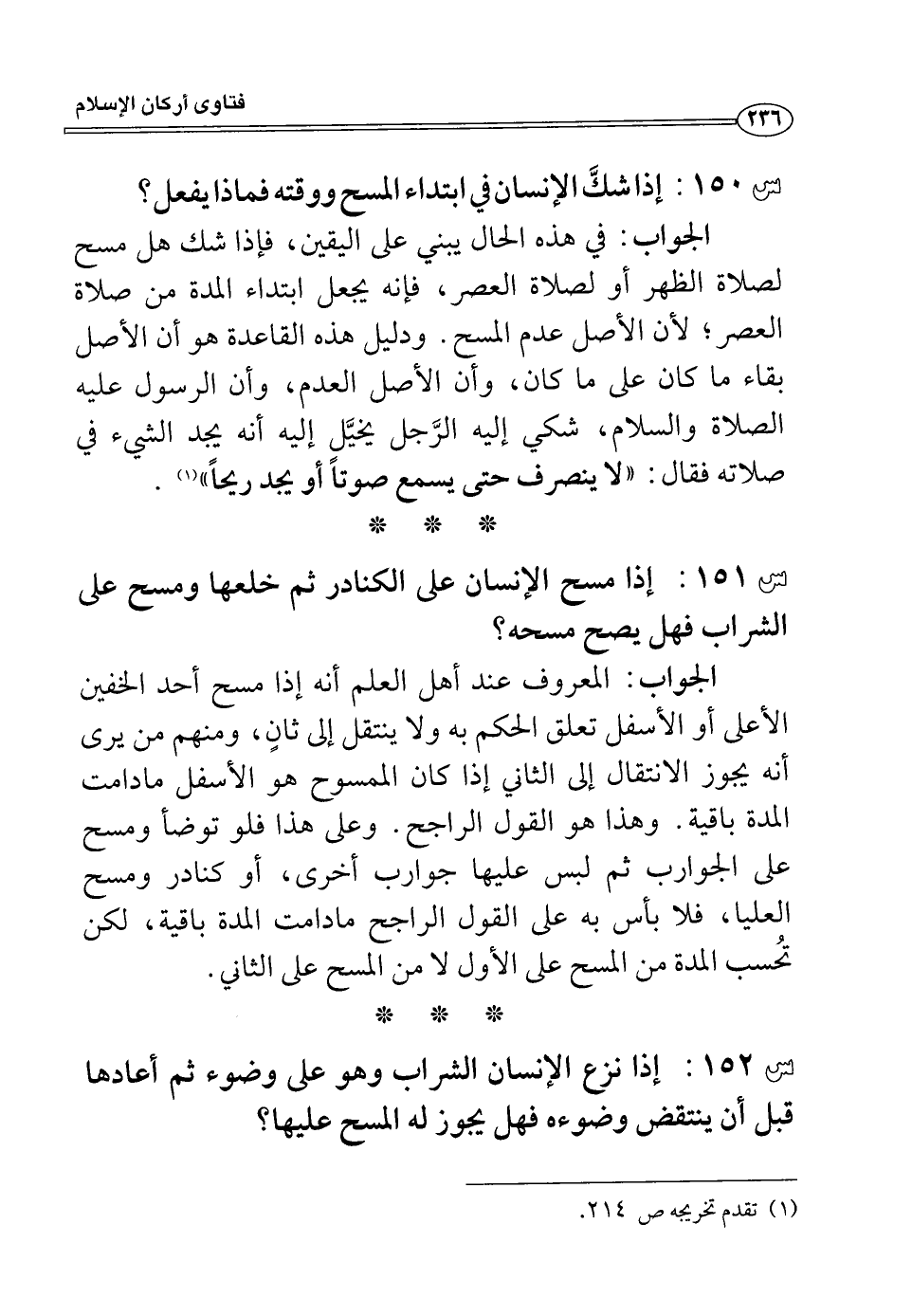 س150: إذا شك الإنسان في ابتداء المسح وقته فماذا يفعل؟