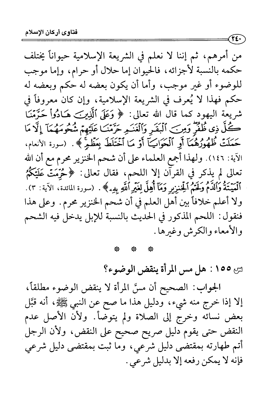 من أمرهم، ثم إننا لا نعلم في الشريعة الإسلامية حيواناً يختلف حكمه بالنسبة لأجزائه، فالحيوان إما حلال أو حرام، وإما موجب للوضوء أو غير موجب، وأما أن يكون بعضه له حكم وبعضه له حكم فهذا لا يعرف في الشريعة الإسلامية، وإن كان معروفاً في شريعة اليهود كما قال الله تعالى: (وَعَلَى الَّذِينَ هَادُوا حَرَّمْنَا كُلَّ ذِي ظُفُرٍ وَمِنَ الْبَقَرِ وَالْغَنَمِ حَرَّمْنَا عَلَيْهِمْ شُحُومَهُمَا إِلَّا مَا حَمَلَتْ ظُهُورُهُمَا أَوِ الْحَوَايَا أَوْ مَا اخْتَلَطَ بِعَظْمٍ) (الأنعام: من الآية146) ولهذا أجمع العلماء على أن شحم الخنزير محرم مع أن الله تعالى لم يذكر في القرآن إلا اللحم، فقال تعالى: (حُرِّمَتْ عَلَيْكُمُ الْمَيْتَةُ وَالدَّمُ وَلَحْمُ الْخِنْزِيرِ وَمَا أُهِلَّ لِغَيْرِ اللَّهِ بِه) (المائدة: من الآية3) ولا أعلم خلافاً بين أهل العلم في أن شحم الخنزير محرم.