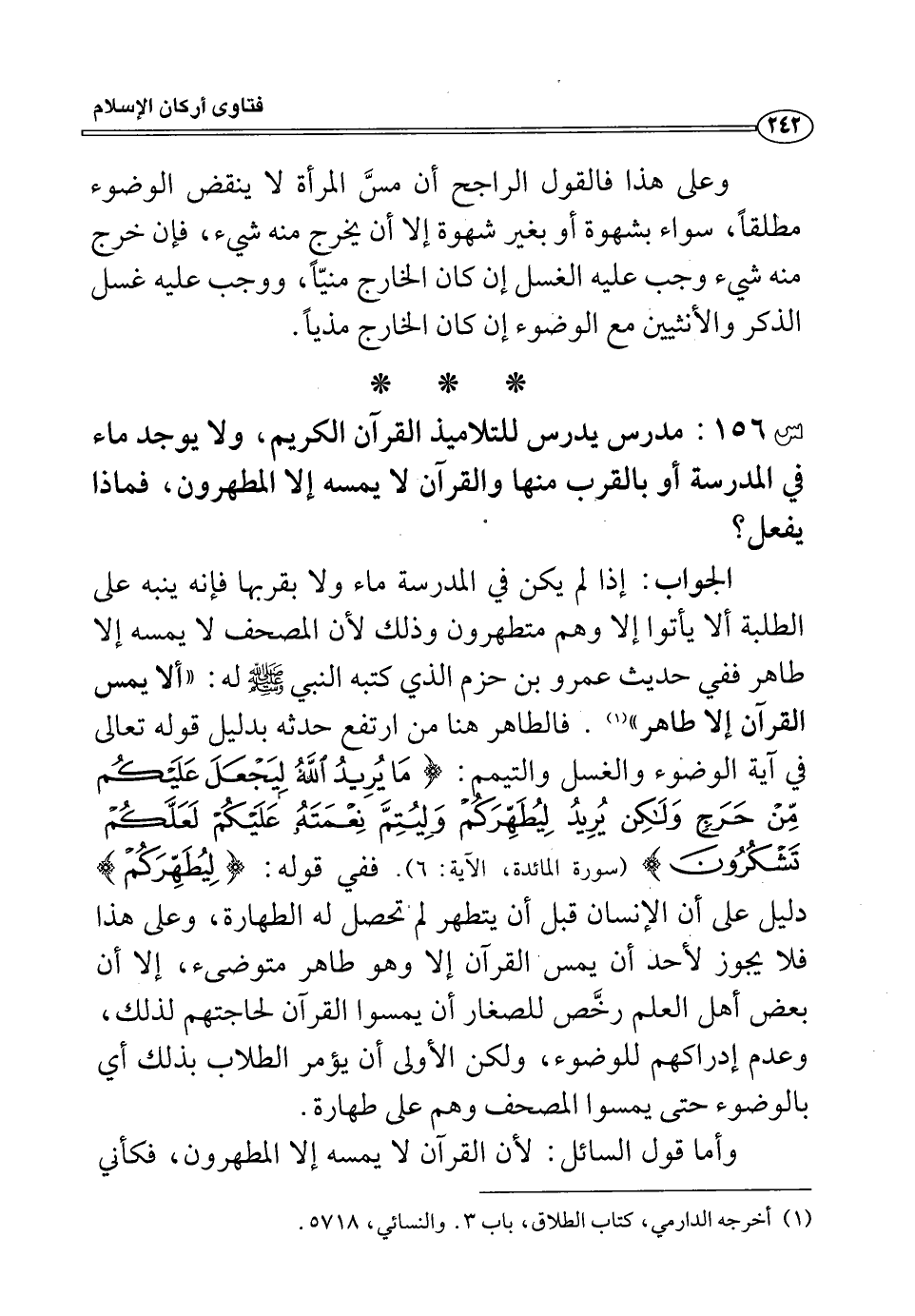 الجواب: إذا لم يكن في المدرسة ماء ولا بقربها فإنه ينبه على الطلبة ألا يأتوا إلا وهم متطهرون وذلك لأن المصحف لا يمسه إلا طاهر في حديث عمرو بن حزم الذي كتبه النبي صلى الله عليه وسلم له: ((ألا يمس القرآن إلا طاهر)) (¬1) فالطاهر هنا من ارتفع حدثه بدليل قوله تعالى في آية الوضوء والغسل والتيمم: (مَا يُرِيدُ اللَّهُ لِيَجْعَلَ عَلَيْكُمْ مِنْ حَرَجٍ وَلَكِنْ يُرِيدُ لِيُطَهِّرَكُمْ وَلِيُتِمَّ نِعْمَتَهُ عَلَيْكُمْ لَعَلَّكُمْ تَشْكُرُونَ) (المائدة: من الآية6) ففي قوله: (ليطهركم) دليل على أن الإنسان قبل أن يتطهر لم تحصل له الطهارة، وعلى هذا فلا يجوز لأحد أن يمس القرآن إلا وهو طاهر متوضئ، إلا أن بعض أهل العلم رخص للصغار أن يمسوا القرآن لحاجتهم لذلك، وعدم إدراكهم للوضوء، ولكن الأولى أن يؤمر الطلاب بذلك أي بالوضوء حتى يمسوا المصحف وهم على طهارة.