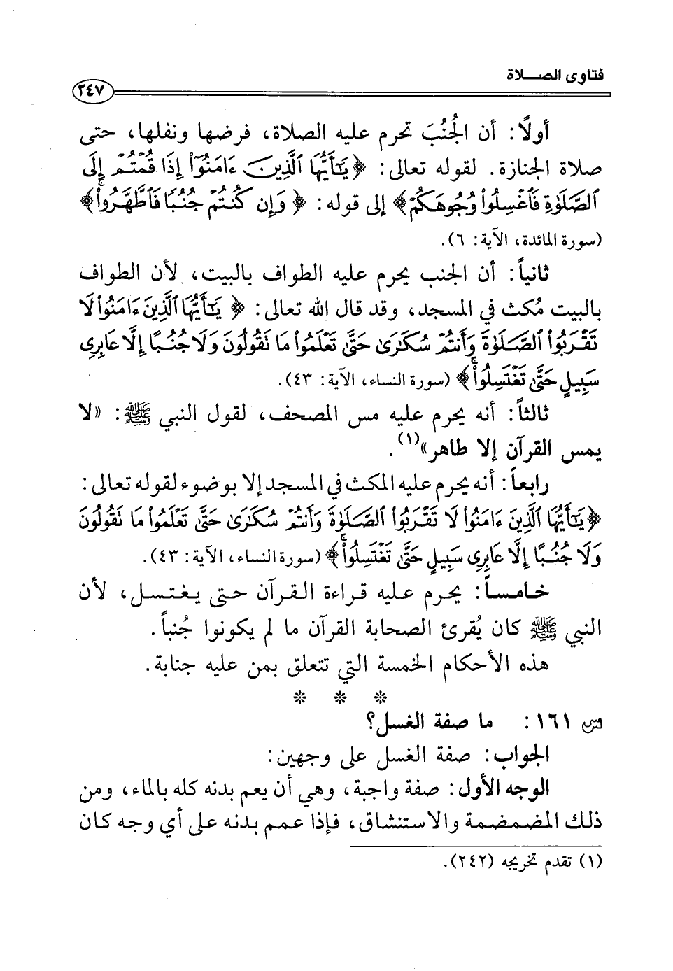 خامساً: يحرم عليه قراءة القرآن حتى يغتسل، لأن النبي صلى الله عليه وسلم كان يقرئ الصحابة القرآن ما لم يكونوا جنباً.